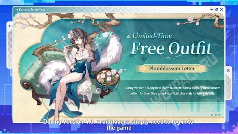 Ученая Жуань Мэй станет следующей героиней, которая получит особый наряд «Письмо с цветами сливы». Забрать костюм бесплатно удастся только в течение версии 4.0. Также в магазине Подарок звездной пыли ожидается выход уникального скина «Боевой задор» для Первопроходца и украшения «Искрящиеся кролики и огненные грибы».