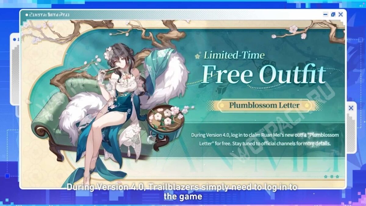 Ученая Жуань Мэй станет следующей героиней, которая получит особый наряд «Письмо с цветами сливы». Забрать костюм бесплатно удастся только в течение версии 4.0. Также в магазине Подарок звездной пыли ожидается выход уникального скина «Боевой задор» для Первопроходца и украшения «Искрящиеся кролики и огненные грибы».