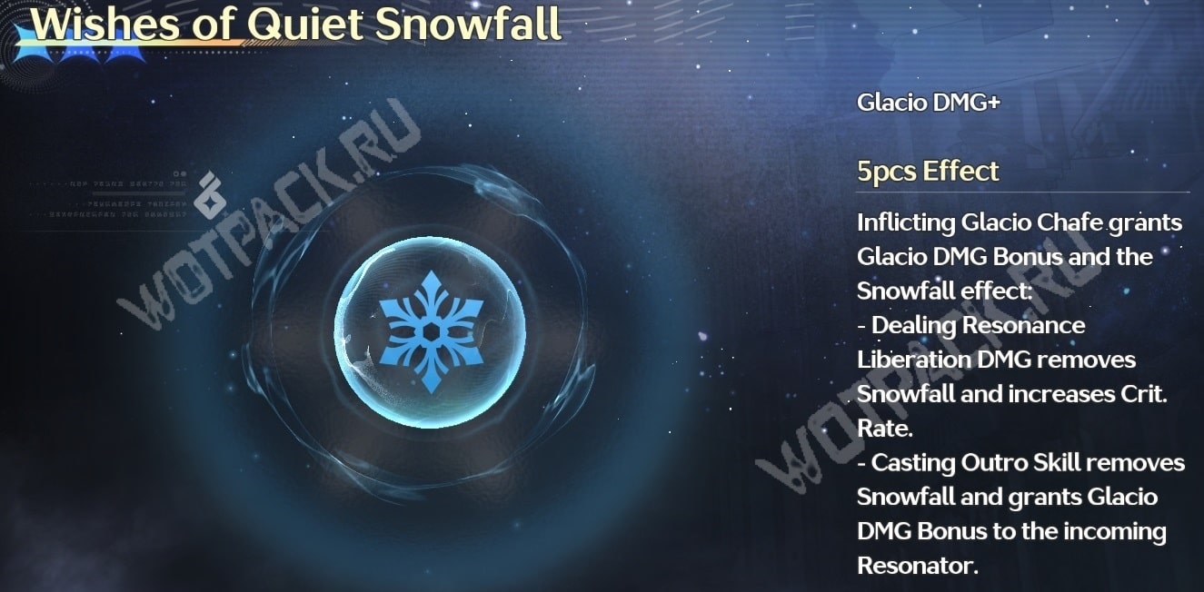 - «Wishes of Quiet Snowfall» — комплект, который повышает крит. шанс или дает бонус Гласио следующему резонатору за наложение стаков «Glacio Chafe». Предназначен для Хиюки, в будущем его также сможет носить саб-дамагер в команде жрицы.
