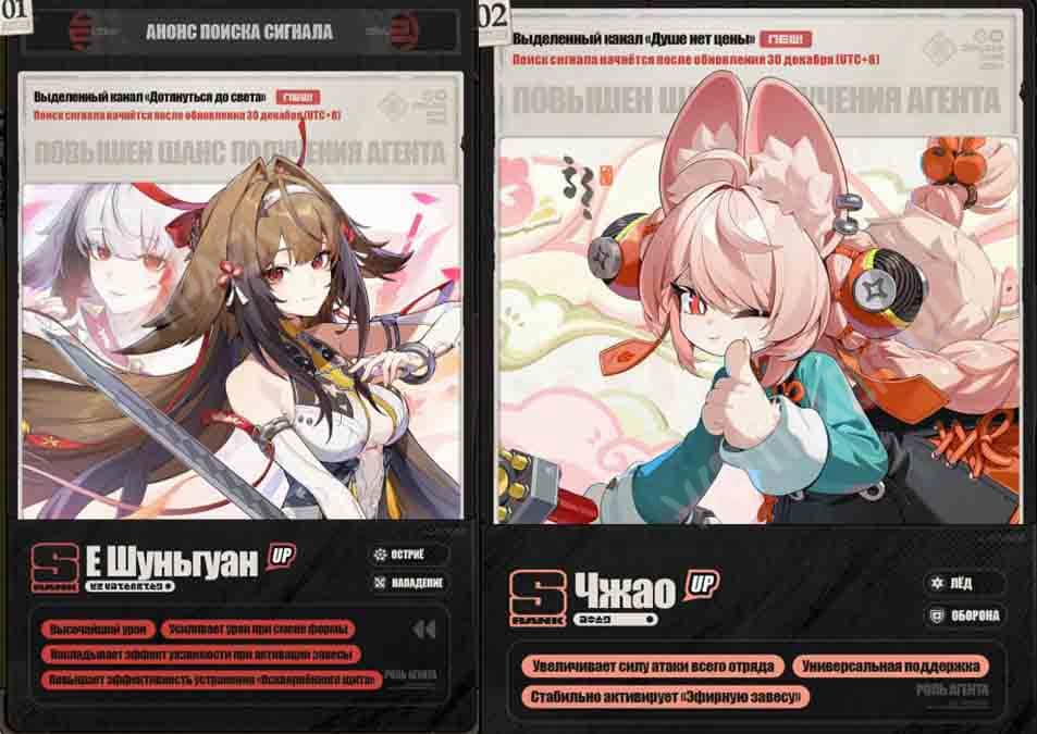 - 21 января 2026 года станут доступны особые поиски сигнала с персонажем и амплификатором на выбор — Элис, Астра Яо или Солдат 0 и их сигны, соответственно. У этих баннеров будет отдельная история, скидка на первые 10 круток и 100% гарант на первую легендарку.