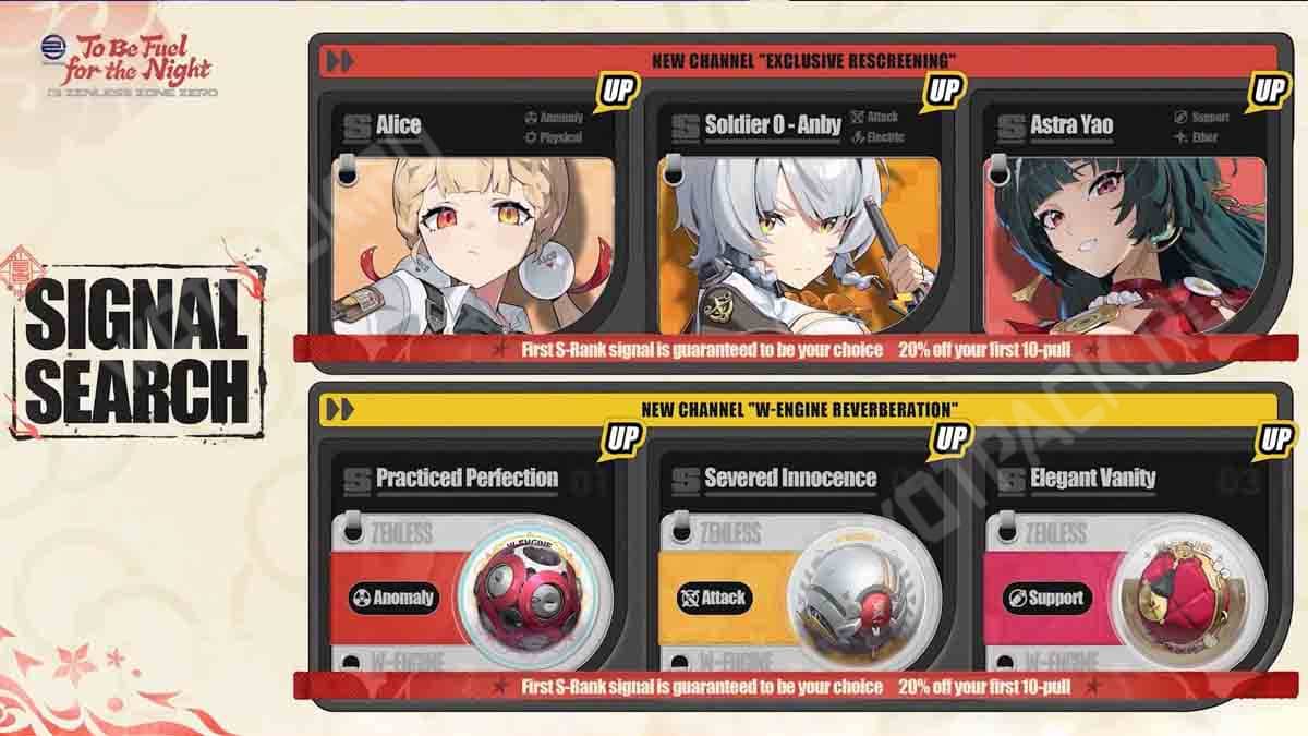 Первыми тремя героинями для селектора станут аристократка Элис (Аномалия, Физический), певица Астра Яо (Поддержка, Эфир), и специальный агент Солдат 0 (Нападение, Электро). В отдельном канале разместятся амплификаторы «Всесторонняя отточенность» (5⭐, Аномалия), «Стильная штучка» (5⭐, Поддержка) и «Чистота утраты» (5⭐, Нападение).