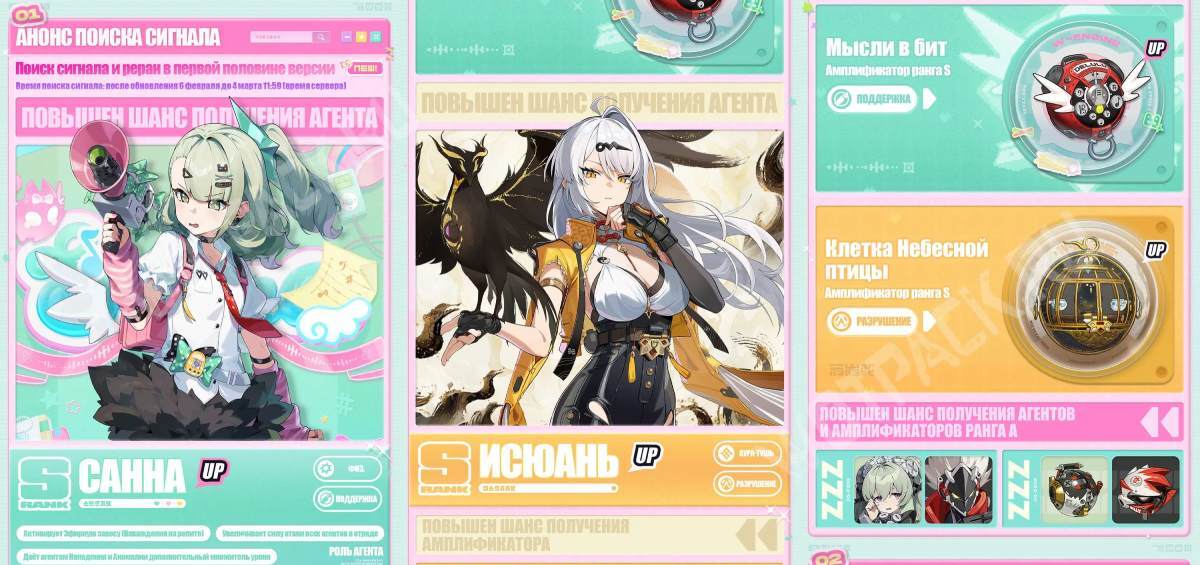 После официального дебюта «Ангелов» в ивентовых баннерах появится Ария (Аномалия, Эфир) и Юдзуха (Поддержка, Физический). Компанию им составят Антон (Нападение, Электро) и Сет (Оборона, Электро).