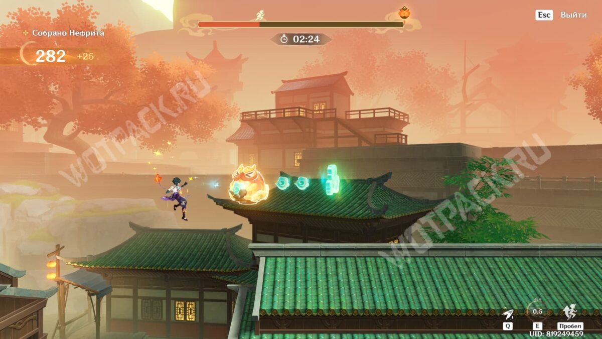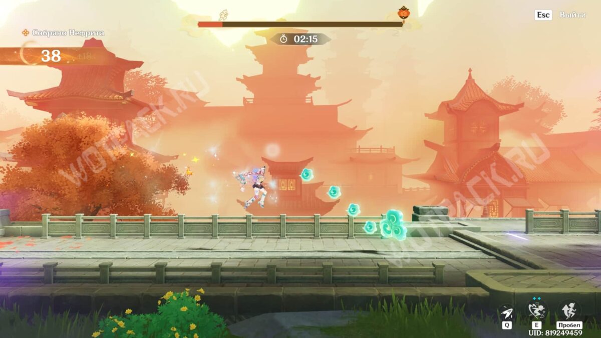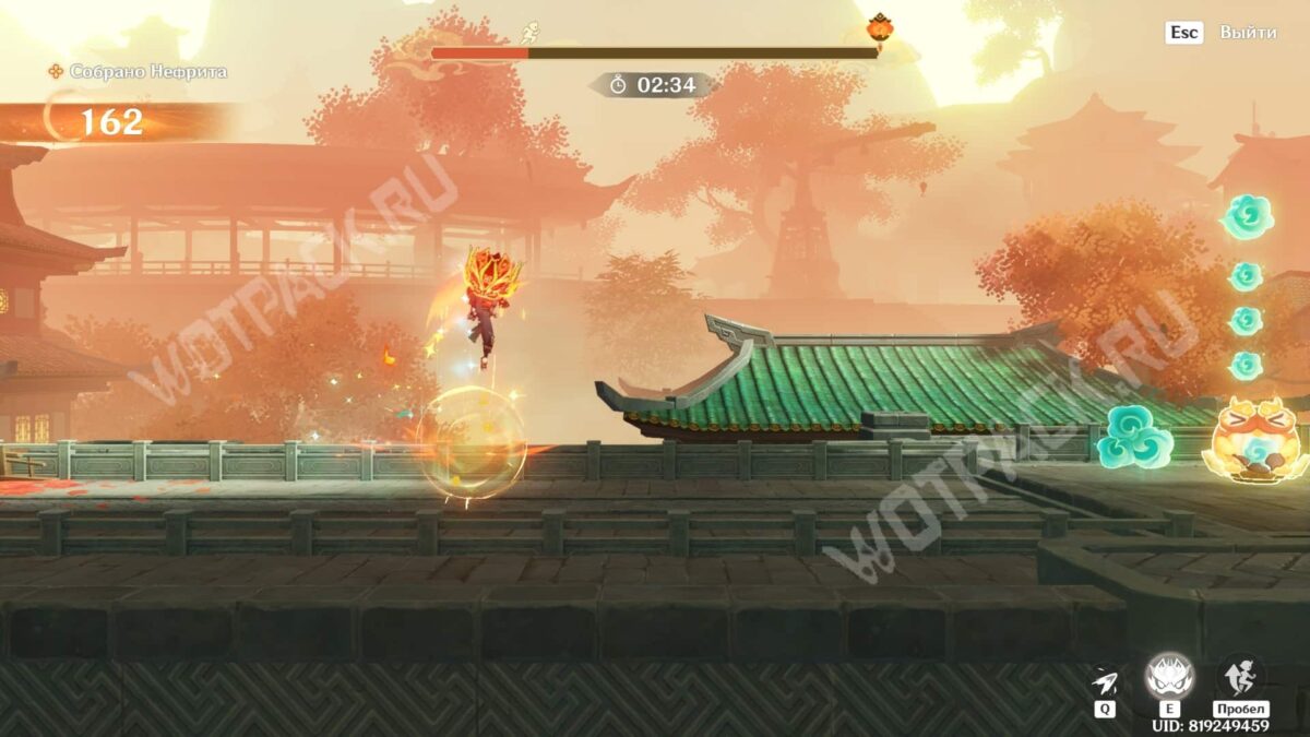 - В «О шагах среди облаков» несколько раз прожимайте Е-шку Адепта Сянь Юнь, чтобы подбирать сферы высоко в воздухе.