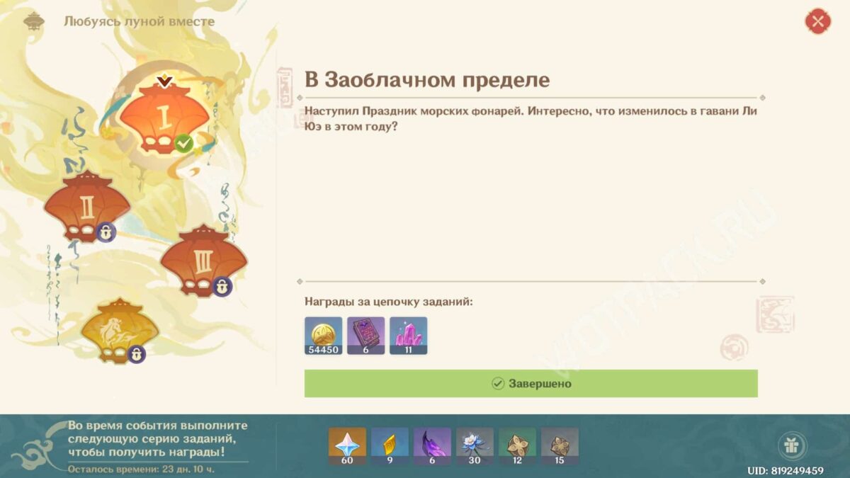История о Цзы Бай не ограничена по времени и останется навсегда, подобно сюжету «Лето! Жара? Курорт!». Лимитированными являются лишь награды за её выполнение до конца события. В разделе ивента «Любуясь луной вместе» сможете быстро отследить все квесты: