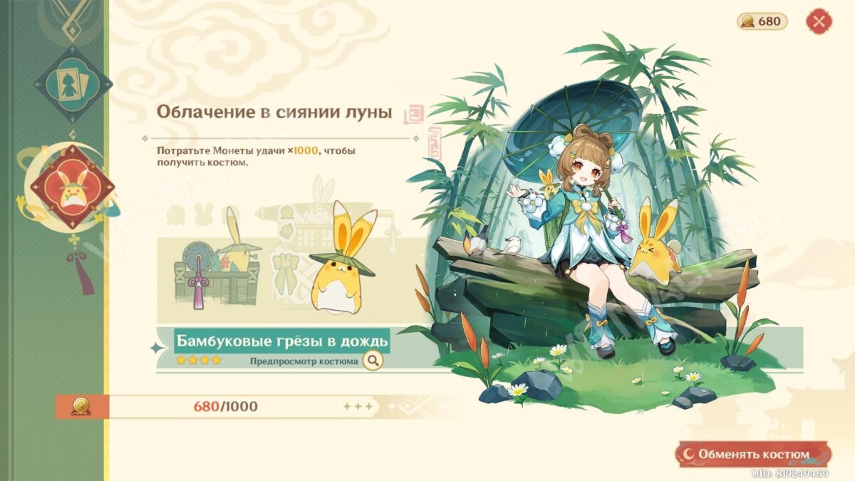 Наберите нужное число Монет удачи, чтобы обменять их на «Бамбуковые грёзы в дождь» — особенный костюм для Яо Яо. Раздел обмена валюты на облик будет доступен в главном меню события.