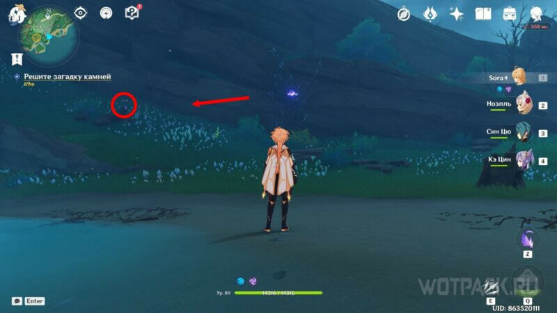 Второй предмет расположен на юге за рекой. Следуйте за феей и доберитесь до небольшого лагеря хиличурлов. В нем под деревом будет находиться камень.