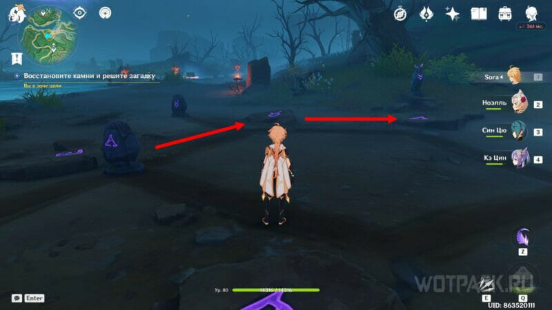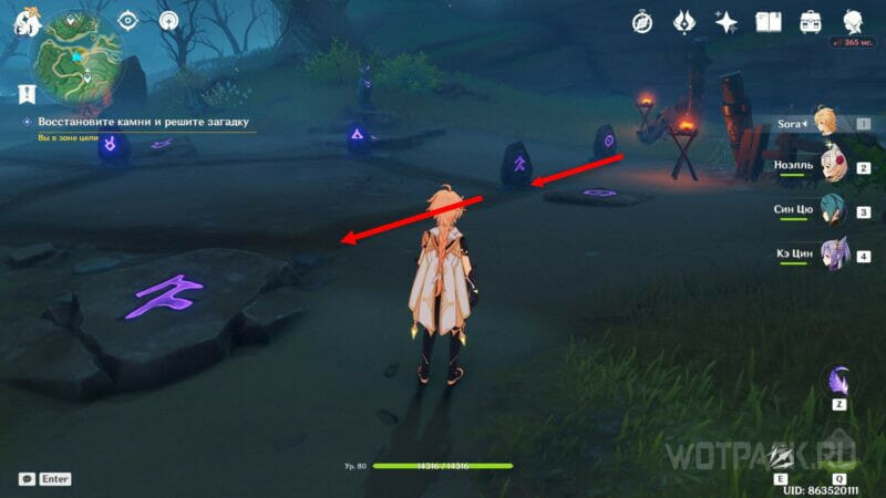 Чтобы решить загадку, ударьте по камням в правильной последовательности. При активации символ ярко загорится.