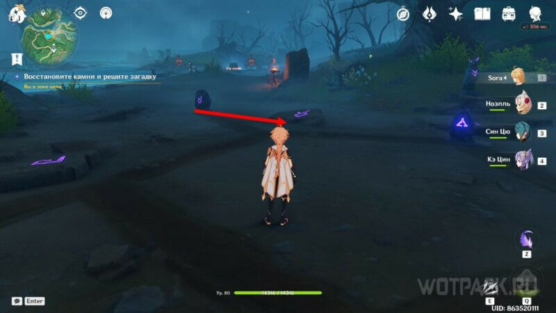 Первый камень находится на востоке. Двигайтесь за феей от громового столба к столбу, чтобы не потеряться, и не забывайте зажигать их Электро атаками. Когда заберете предмет, рядом активируется страж руин, которого нужно победить. Вернитесь и поместите камень на место.