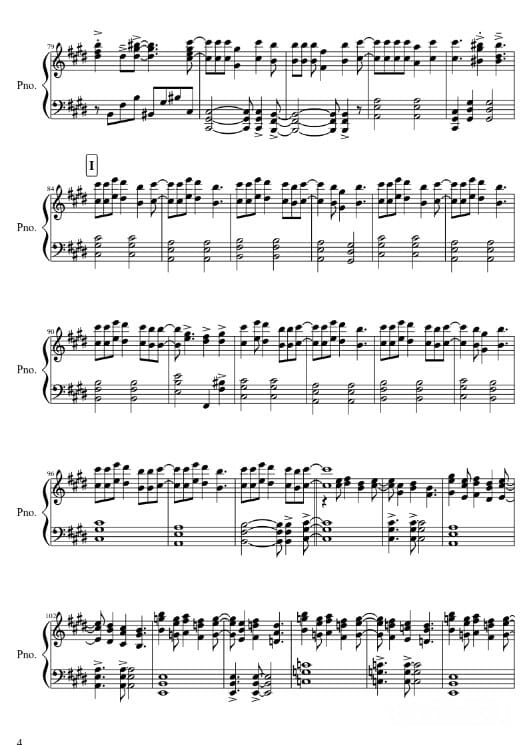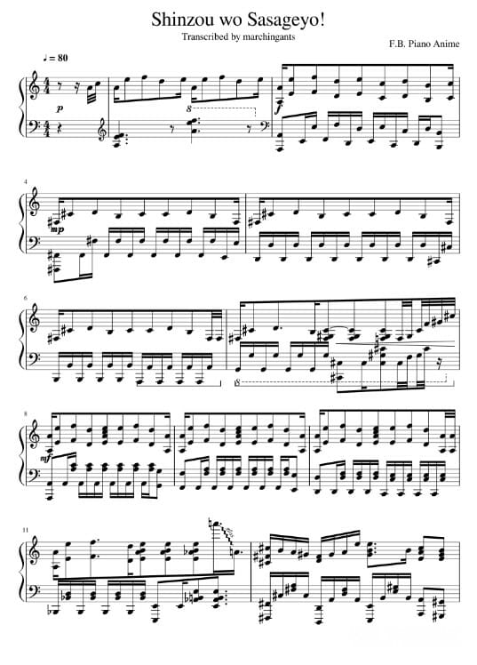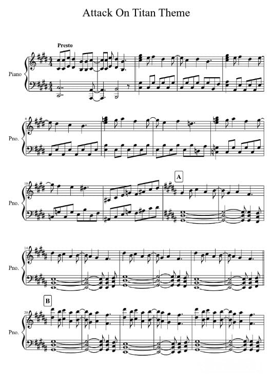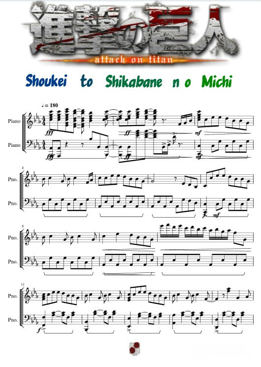 Далее представлены ноты опенинга Атаки титанов на пианино для композиции «Shoukei to Shikabane no Michi». Автор аранжировки: GuillermoVN.