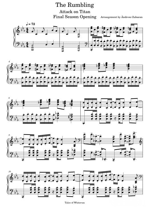 Ноты опенинга «The Rumbling» для игры на пианино под аранжировкой Andreas Zubaran.