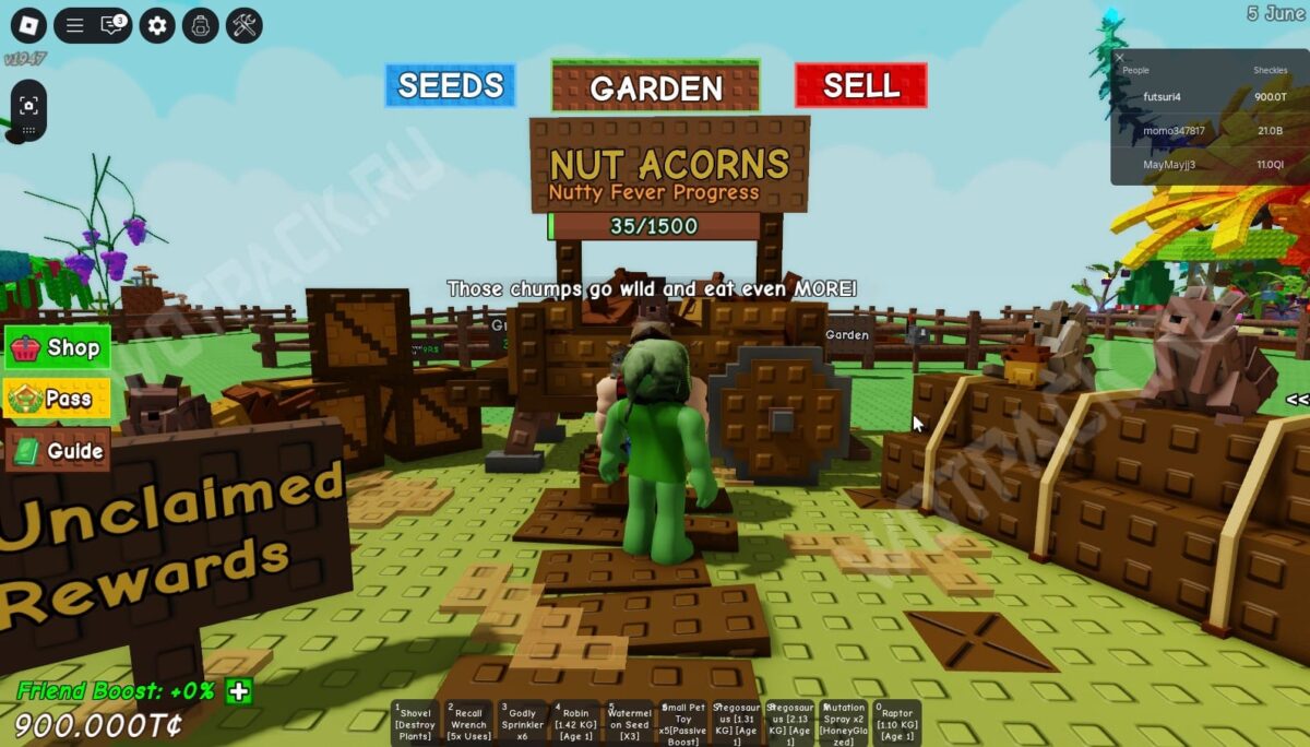 Расположив питомца на грядках, останется просто ждать его вырастания. Пассивка грызуна заключается в том, что каждые 2 минуты он съедает случайный фрукт в саду и набирает 0,009 килограмма веса. При этом избранные фрукты и плоды, с которых урожай собирается лишь единожды, игнорируются.