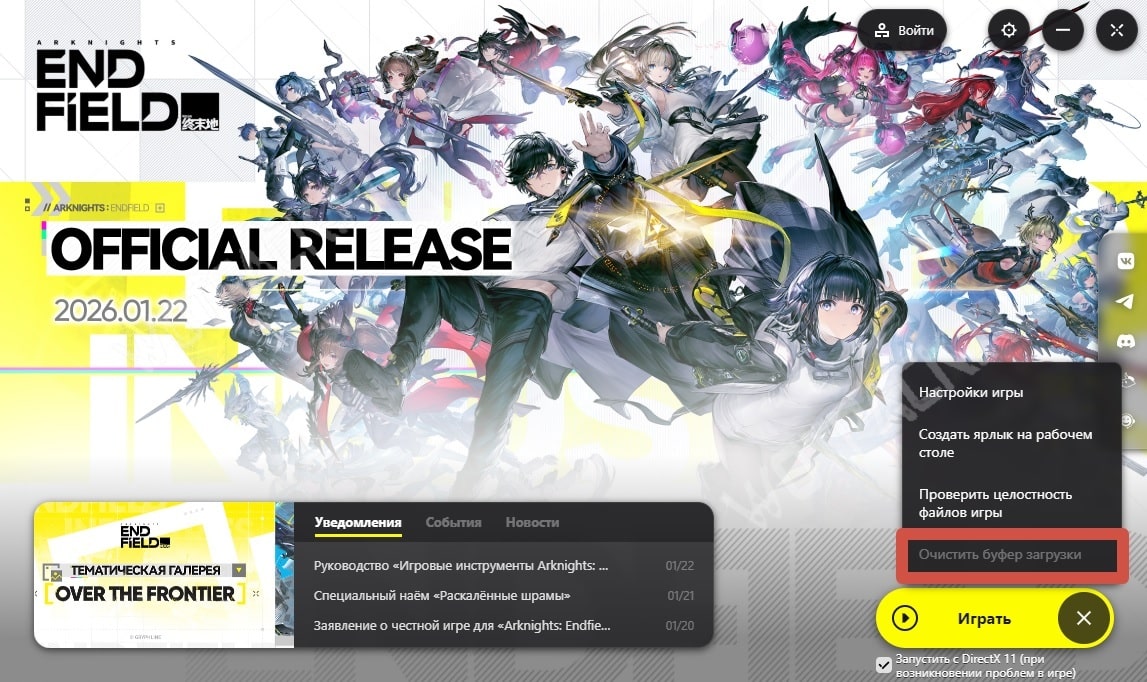 В лаунчере разверните раздел с дополнительным функционалом (серый «кружок» напротив «Играть») и почистите кэш. Так при повторной установке патча система создаст новый чистый буфер, что должно устранить зависания.