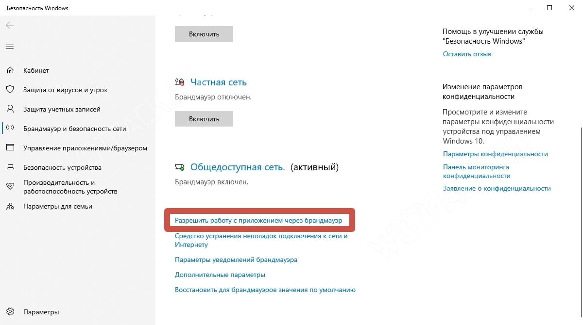 - Путь для Windows 10: Параметры —> Безопасность —> Брандмауэр и безопасность —> Разрешить работу с приложением через брандмауэр.