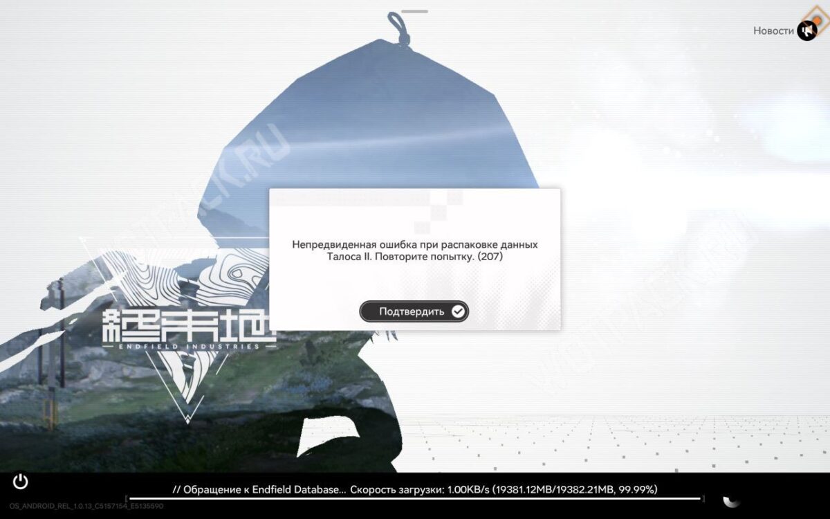 Код ошибки 207 — сбой в Arknights: Endfield, связанный с проблемой интернет-подключения между устройством пользователя и игровыми серверами. Возникает при попытке скачать или установить обновление и сопровождается экранным уведомлением «Непредвиденная ошибка при распаковке данных Талоса II» после запуска клиента, либо сообщением «Нестабильное сетевое соединение» в библиотеке GRYPHLINE.