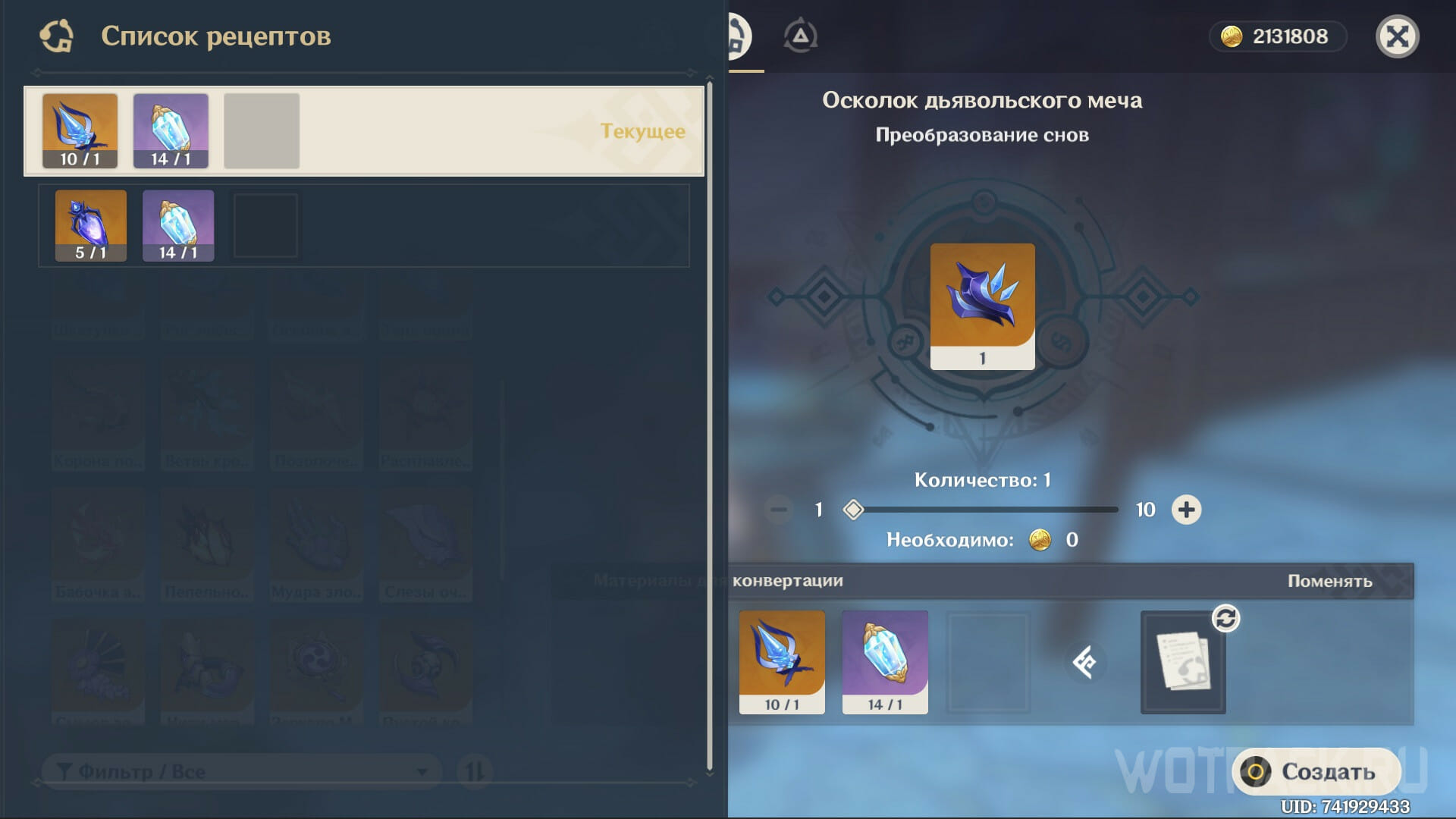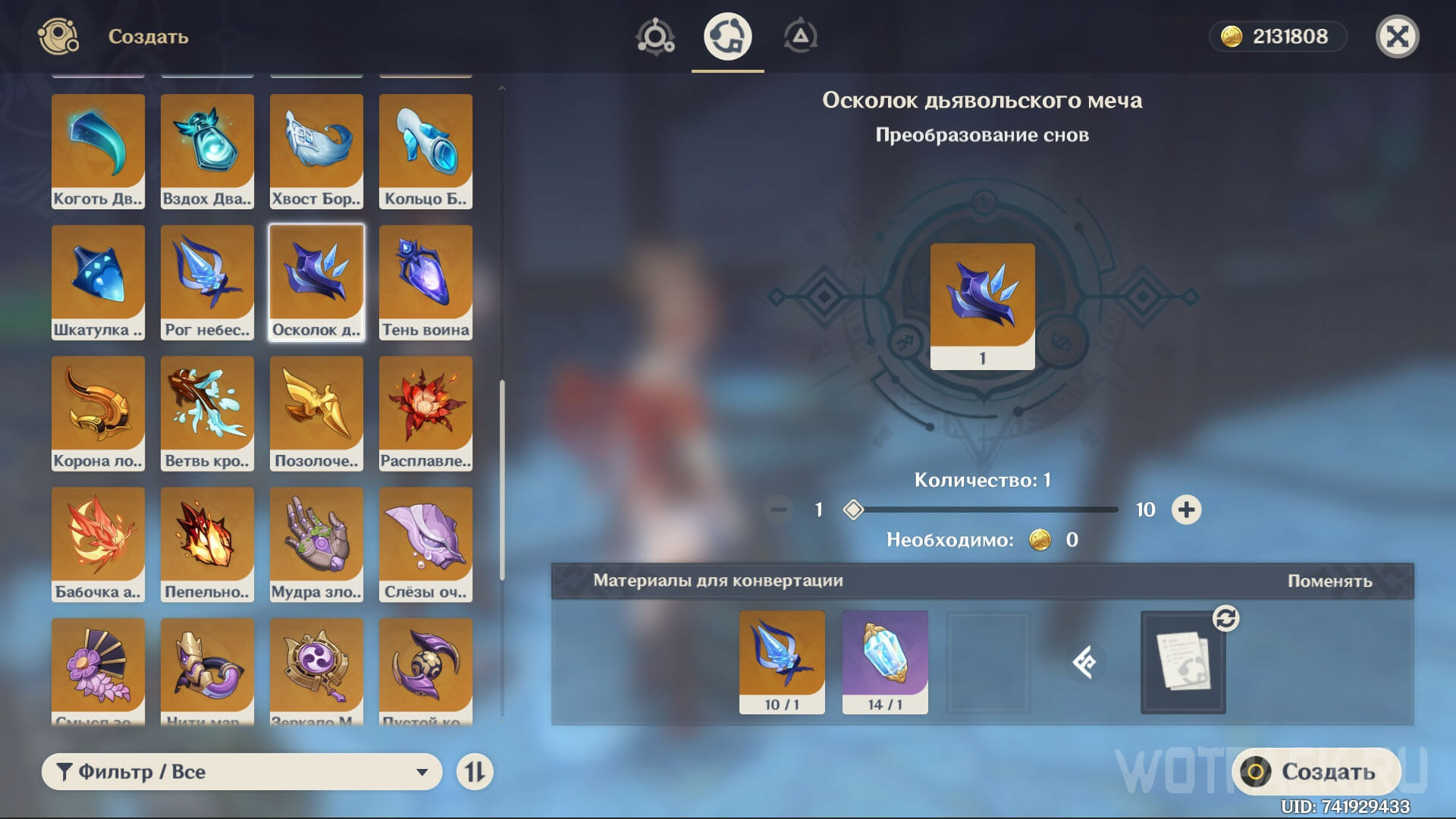 Также Осколок дьявольского меча можно создать из других материалов с босса Чайльда — Рога небесного кита или Тени воина. Для этого воспользуйтесь алхимической стойкой в любом городе, выберите нужный рецепт и объедините имеющиеся материалы с Растворителем снов.