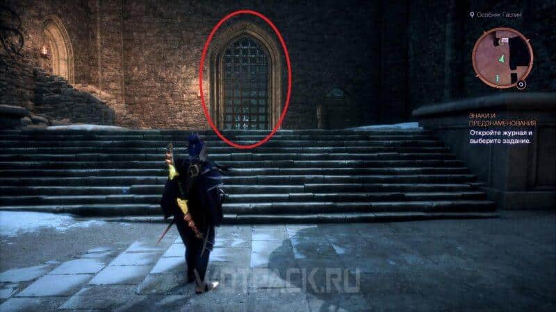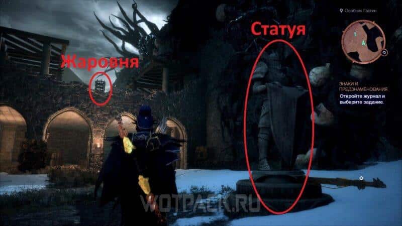 Третью статую найдете в северном углу двора. Дважды поверните ее в любом направлении, и внутри жаровни над входом в подвал вспыхнет огонь.