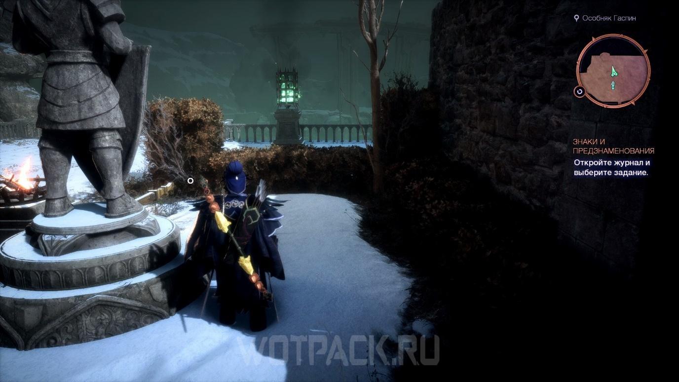 Первую поворачиваемую статую найдете в северо-восточном углу двора. Разверните ее один раз по часовой стрелке, и жаровня рядом со входом в локацию вспыхнет зеленым пламенем.