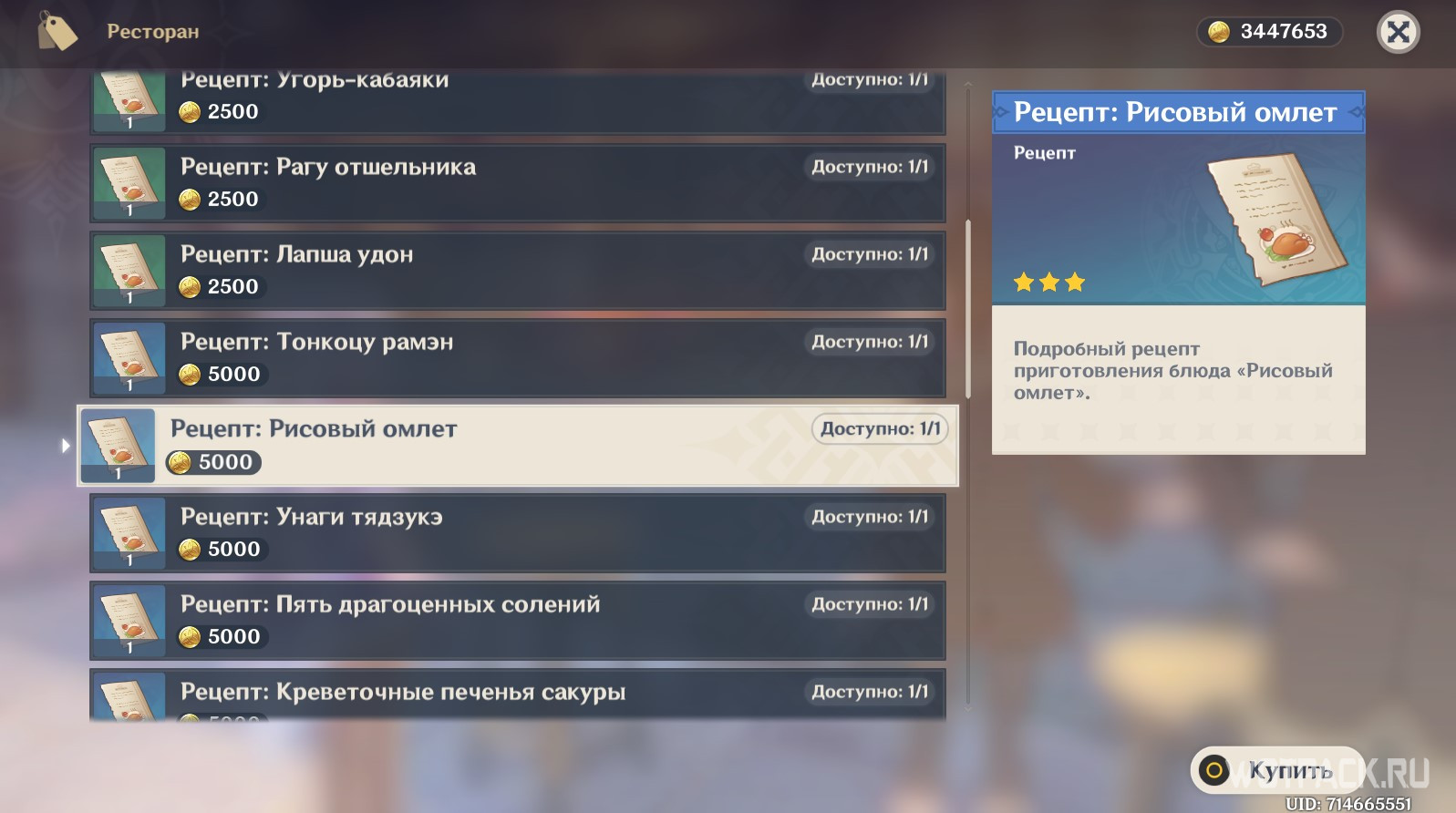 Рецепт Рисового омлета продает Симура Камбэй в Инадзуме. Чтобы попасть к нему, телепортируйтесь к точке, которая находится ближе к входу в город. Поднимитесь по лестнице и поверните налево. Рецепт стоит 5000 моры.