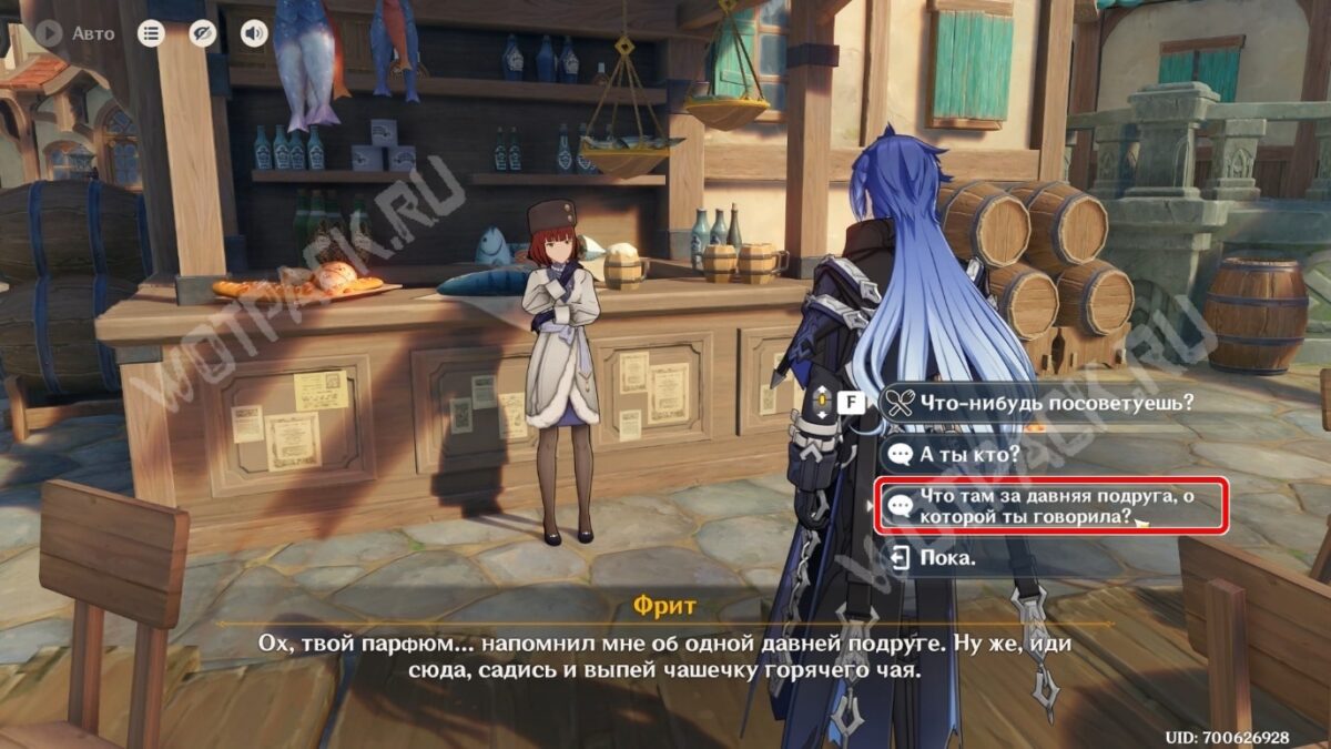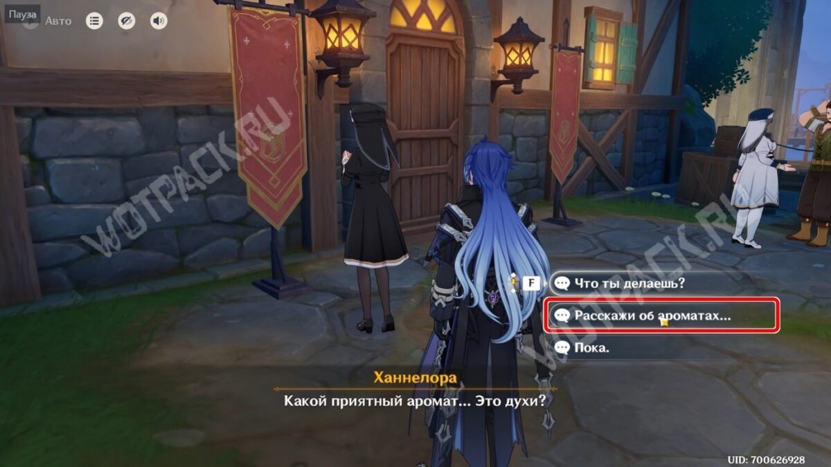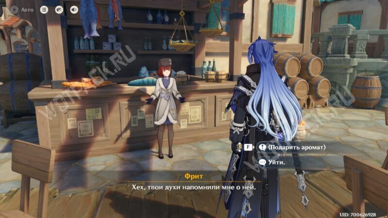 Поднимитесь ближе к восточной точке телепортации портового городка. Подойдите к хозяйке ресторана Фрит. Как и в случае с Ханнелорой, она сразу отреагирует на запах духов фразой «Незабываемый аромат…».