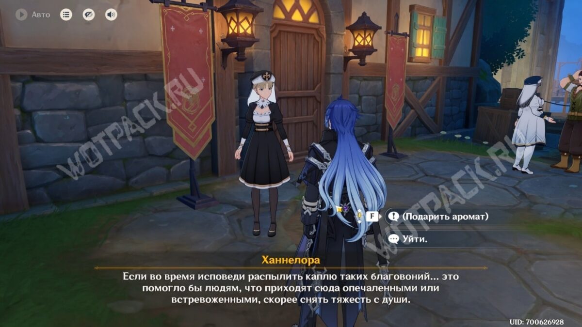 Когда приблизитесь с активным эффектом от духов, она сразу прокомментирует приятный аромат. Поговорите со священницей и попросите рассказать об ароматах. После этого появится возможность сделать подарок. Девушка откажется от парфюма, но поблагодарит и даст книжку «Откровения о божественной любви».