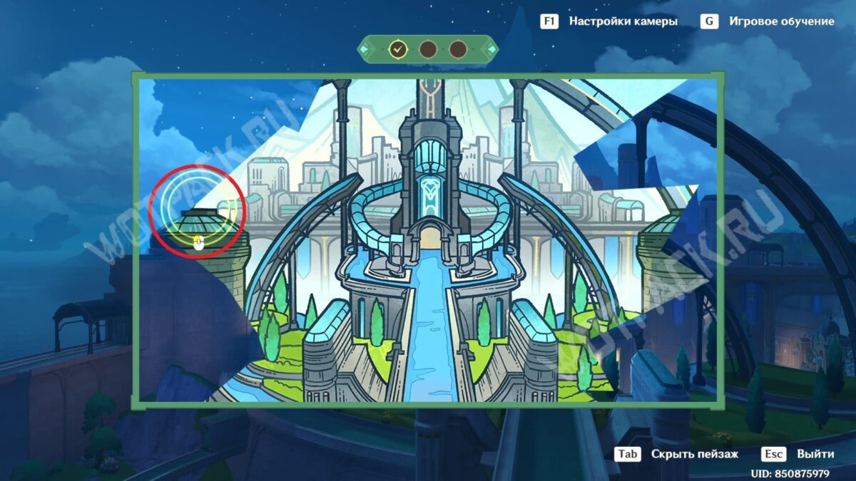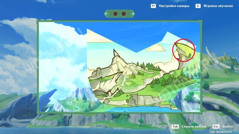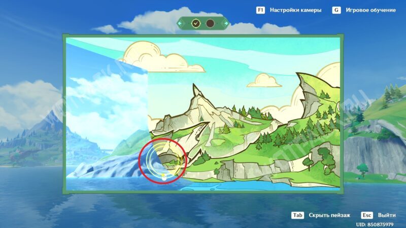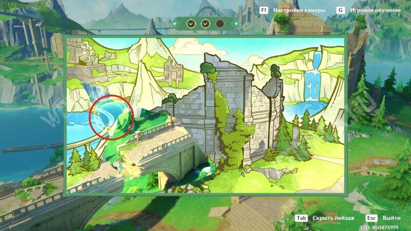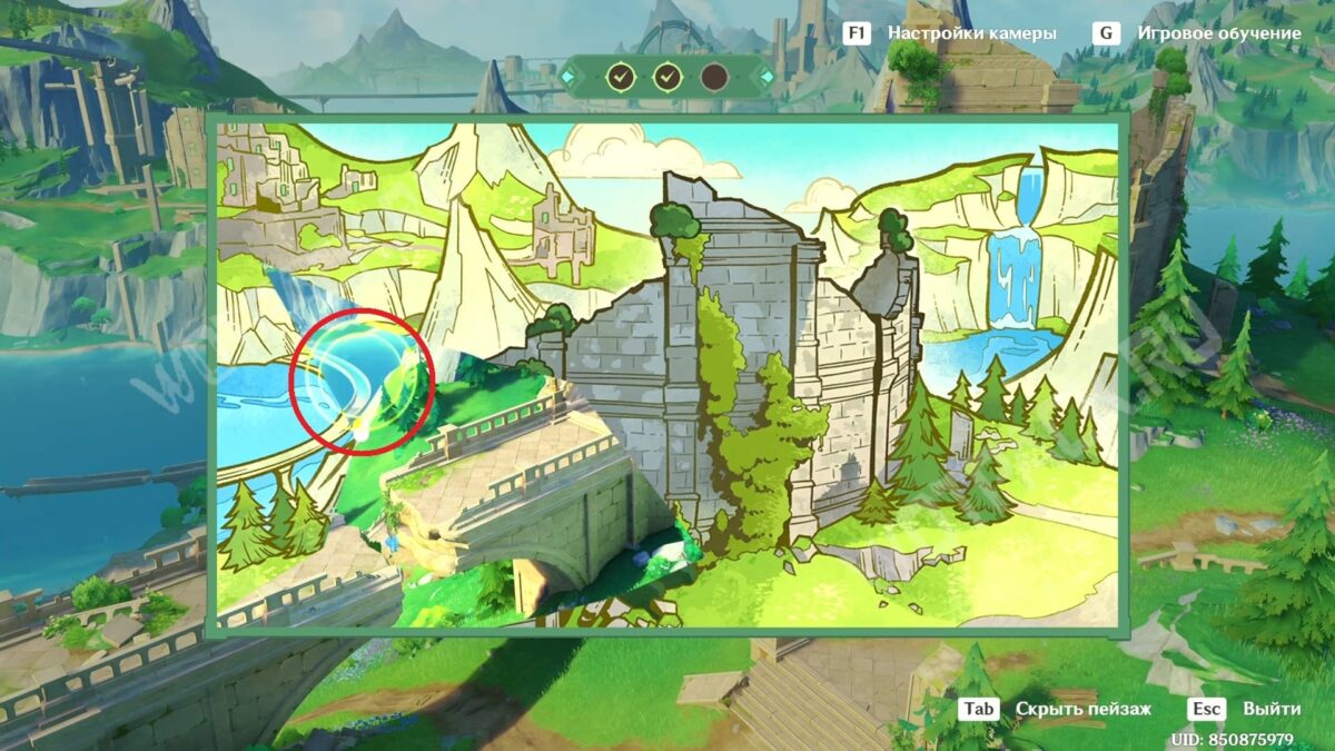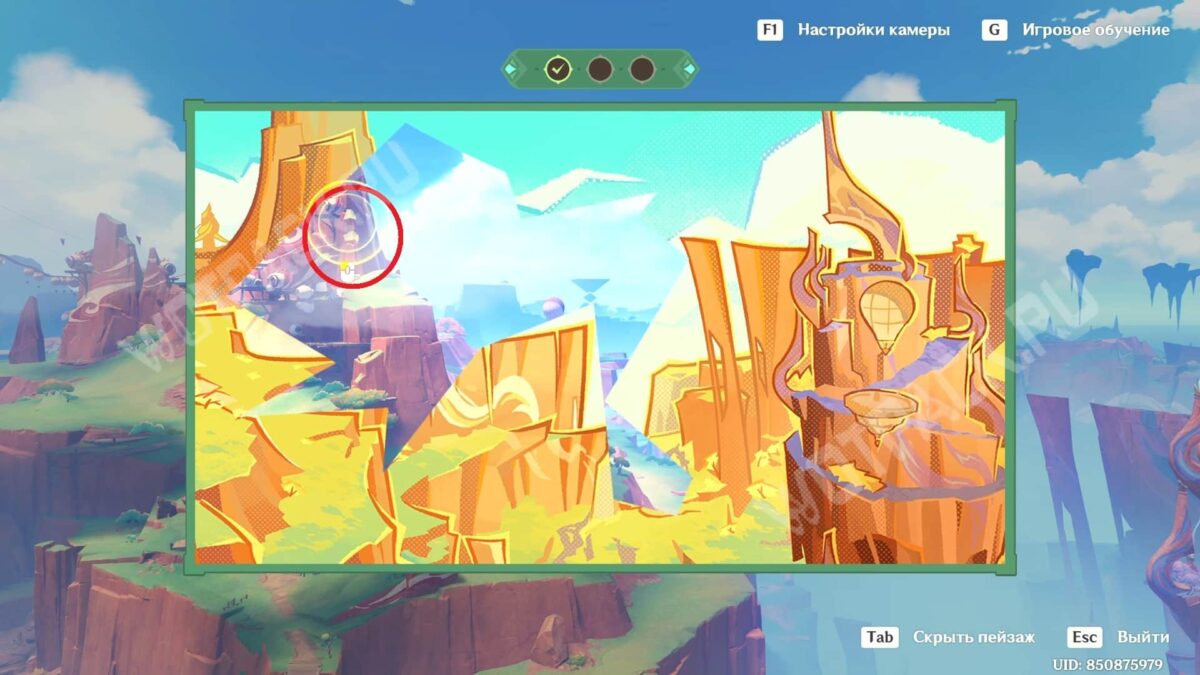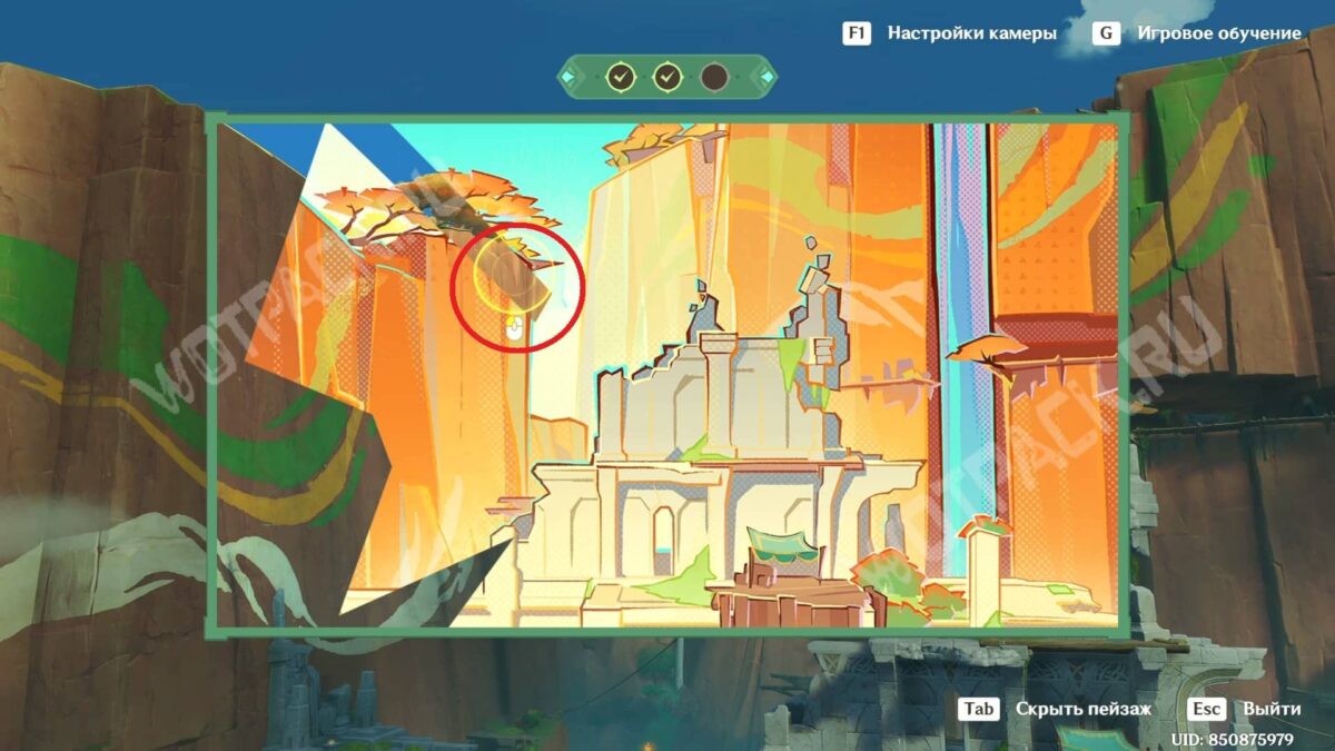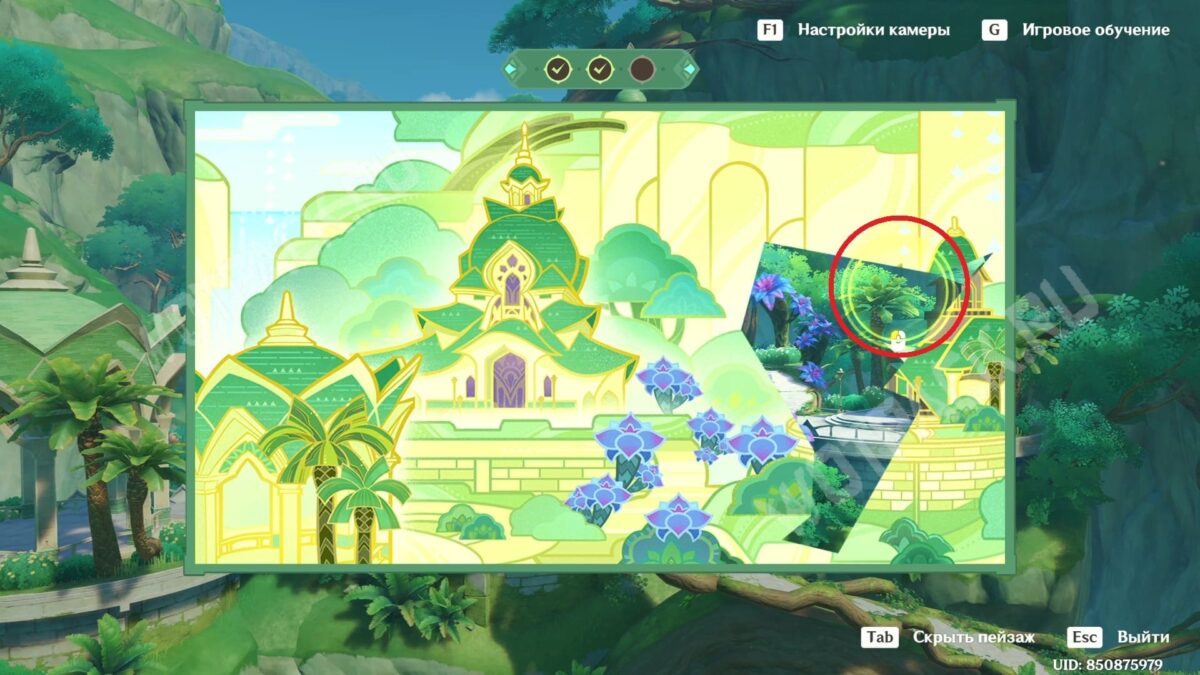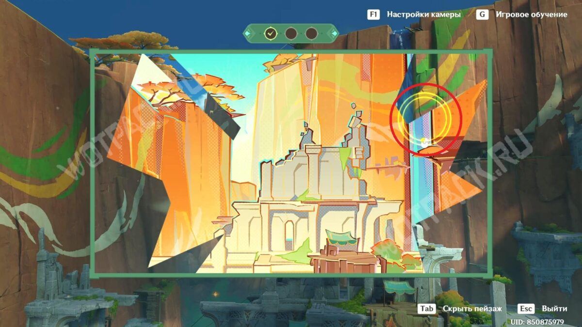 Отправляйтесь к месту осмотра достопримечательностей. Оно находится на территории Храма предков. Сравните пейзаж с рисунком Паймон, чтобы восстановить его. Когда фрагменты окажутся в нужной точке, под ними появится иконка мыши с расходящимися жёлтыми кругами.
