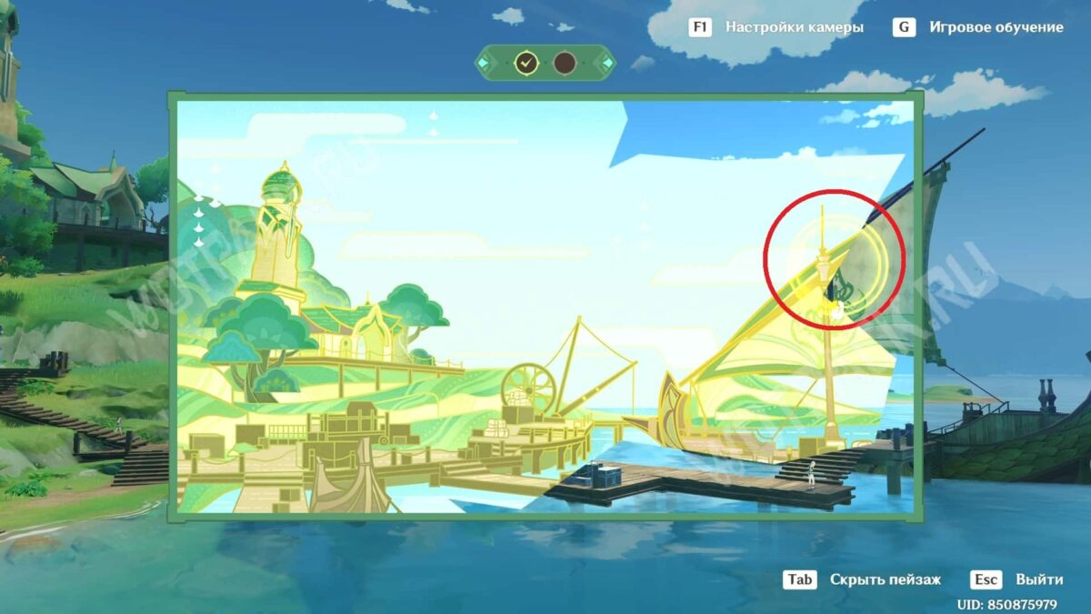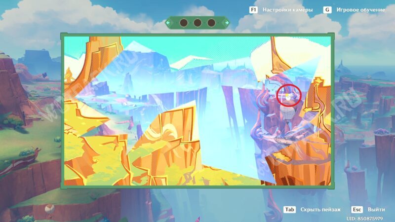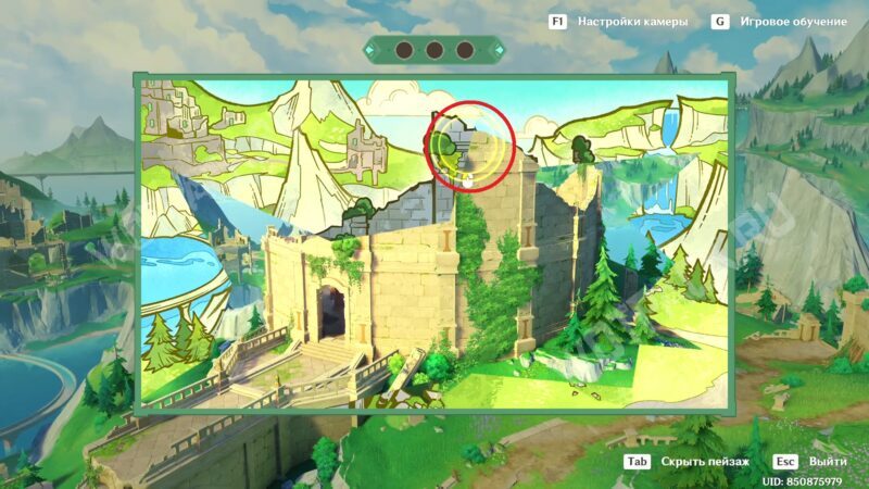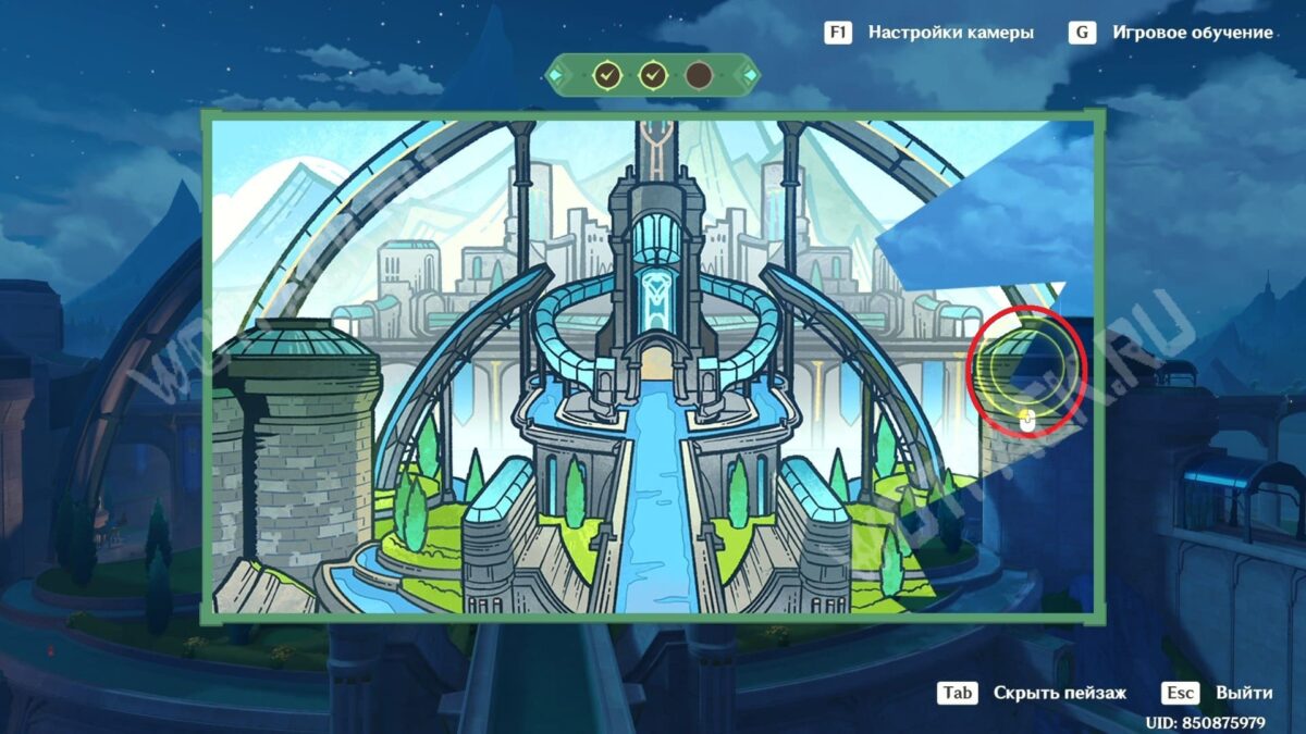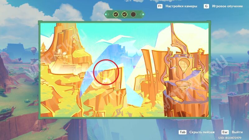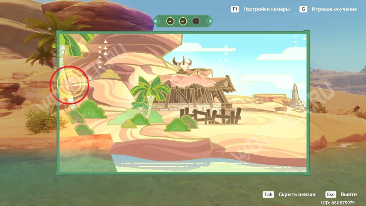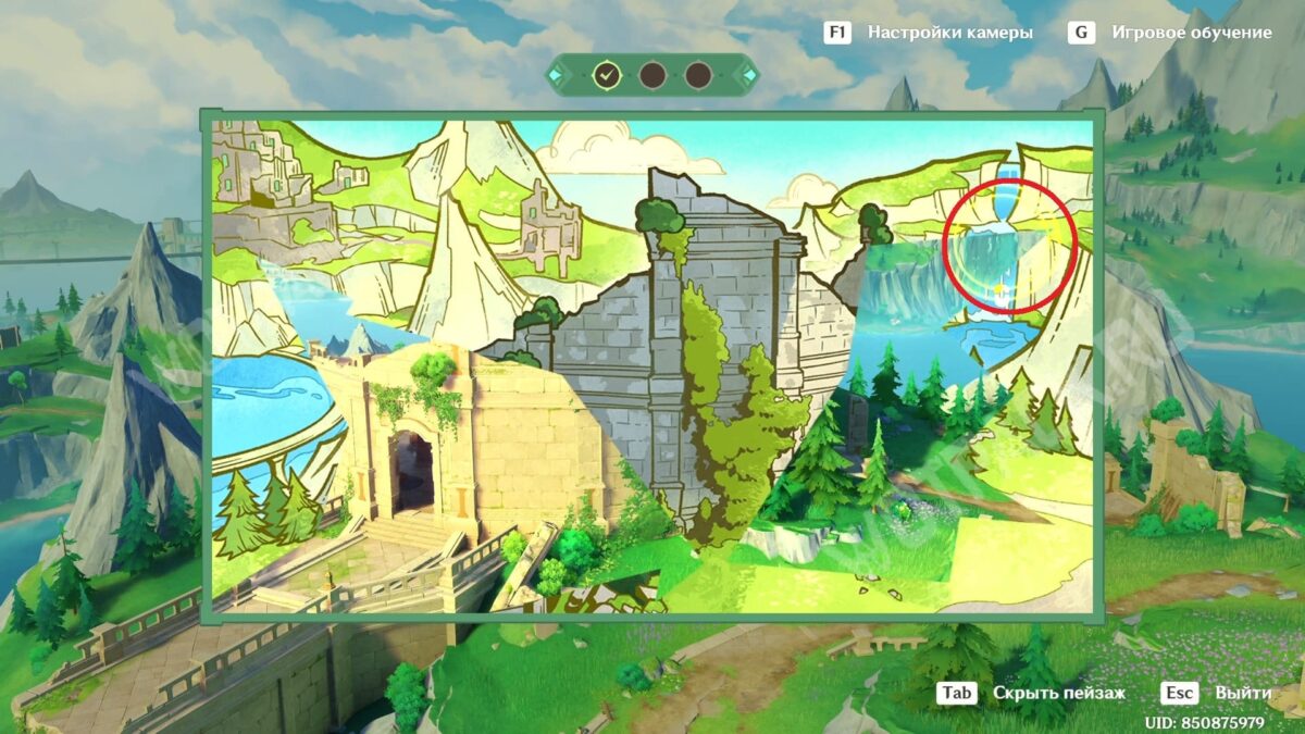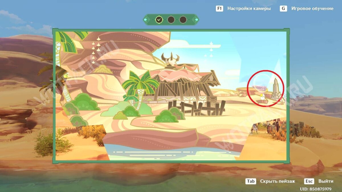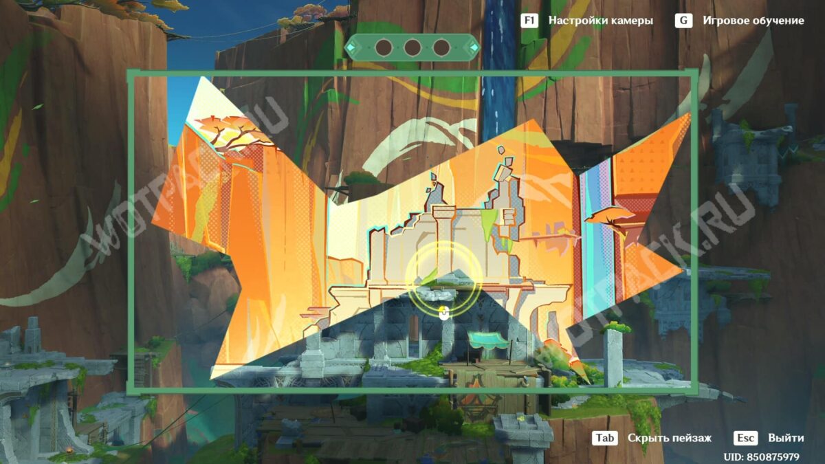 Отправляйтесь к месту осмотра достопримечательностей. Оно находится на территории Храма предков. Сравните пейзаж с рисунком Паймон, чтобы восстановить его. Когда фрагменты окажутся в нужной точке, под ними появится иконка мыши с расходящимися жёлтыми кругами.
