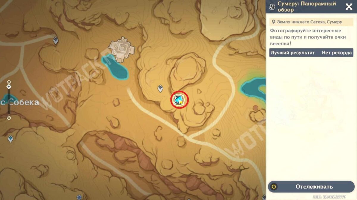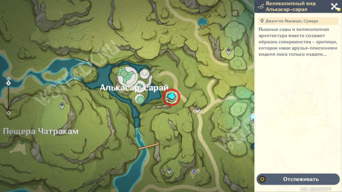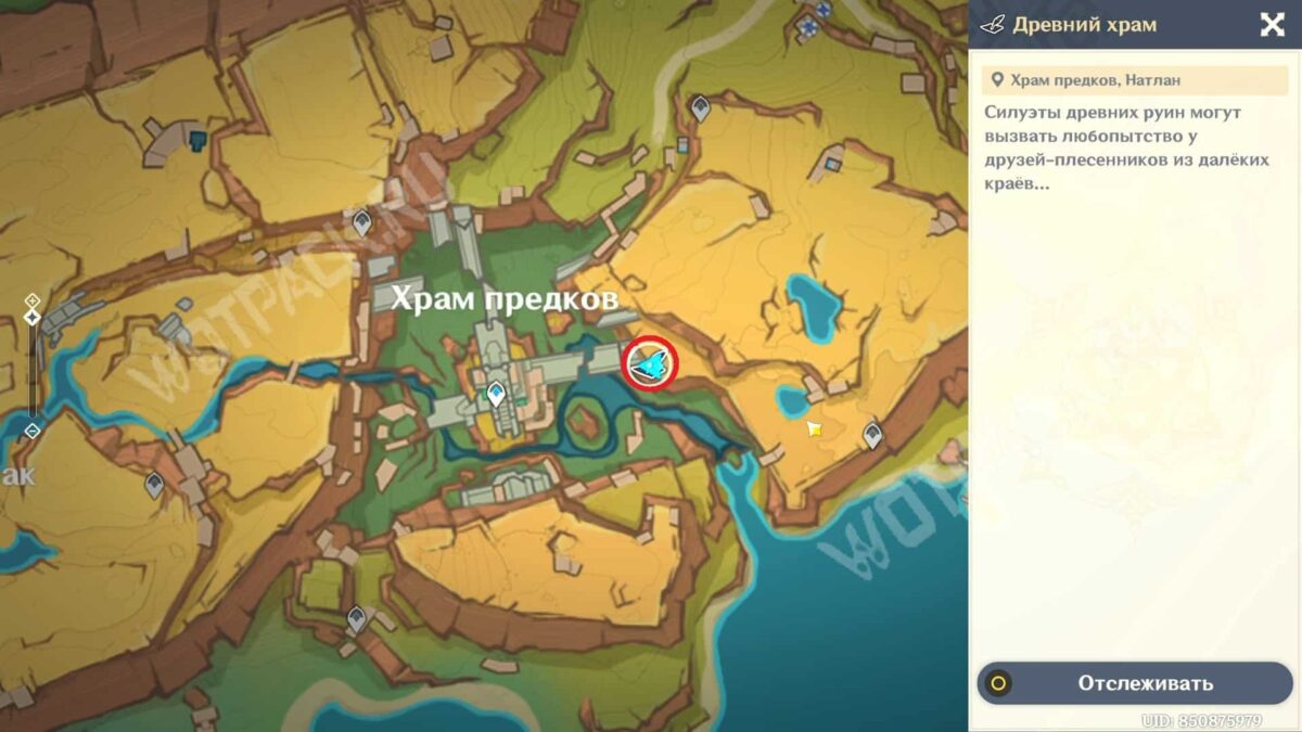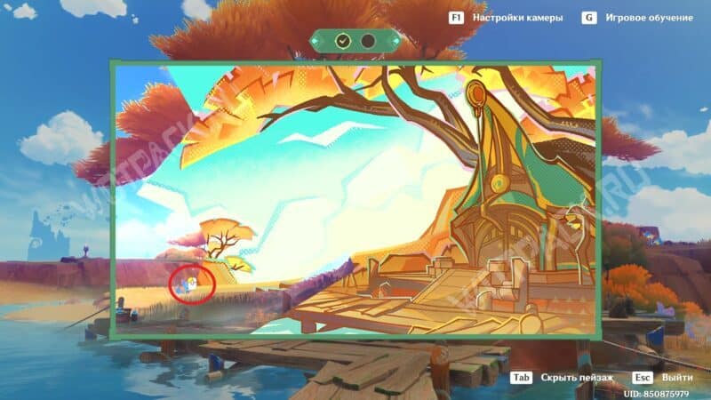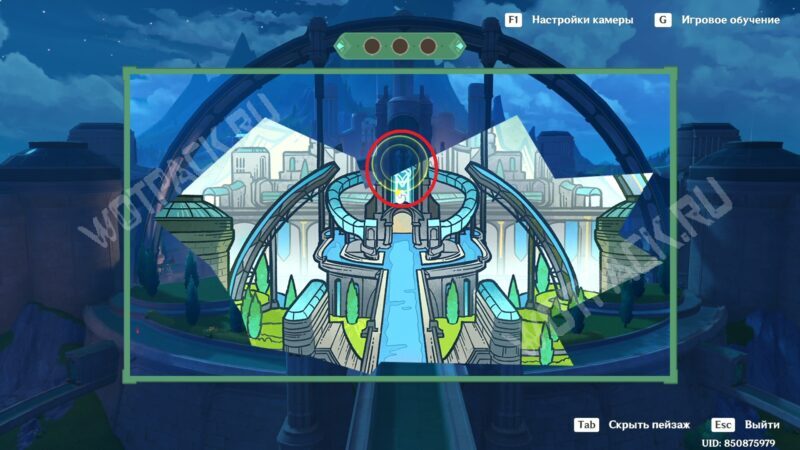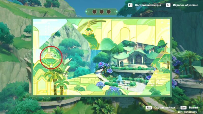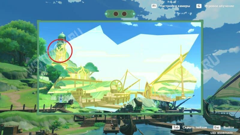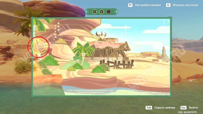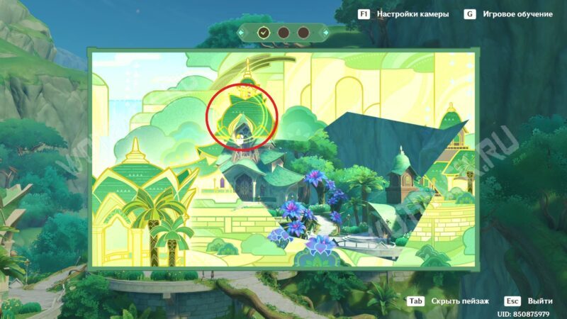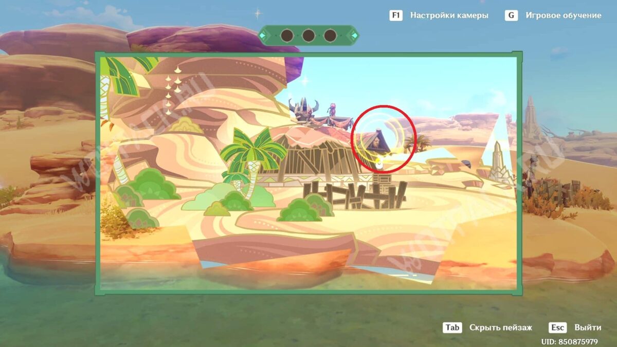 Отправляйтесь к месту осмотра достопримечательностей. Оно находится на территории Храма предков. Сравните пейзаж с рисунком Паймон, чтобы восстановить его. Когда фрагменты окажутся в нужной точке, под ними появится иконка мыши с расходящимися жёлтыми кругами.
