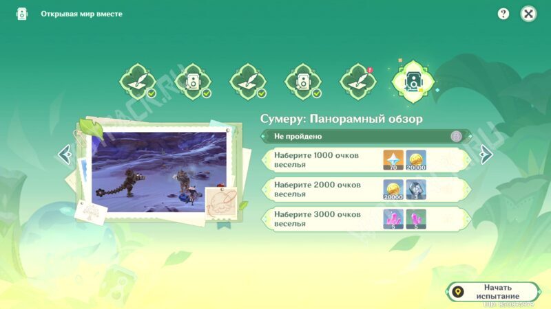 Если желаете быстро закрыть «Боевой пропуск», в игровом процессе «Сумеру: Понорамный обзор» получите 3000 оч. веселья за ×1500 опыта.