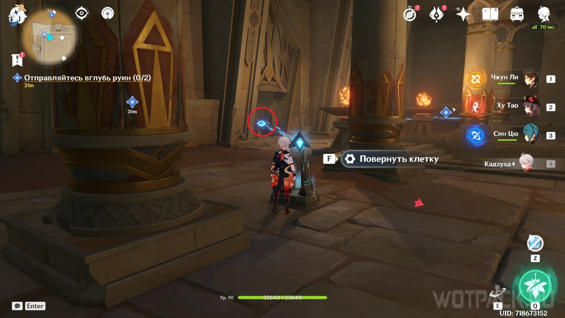 Для начала заберите тот предмет, что находится внутри здания. От лагеря Фатуи двигайтесь прямо к входной двери мимо колонны с Дендрокулом. Отворите проход с помощью механизма рядом.