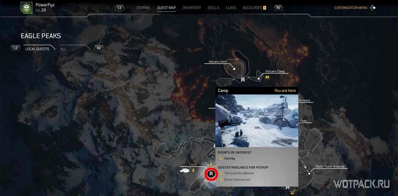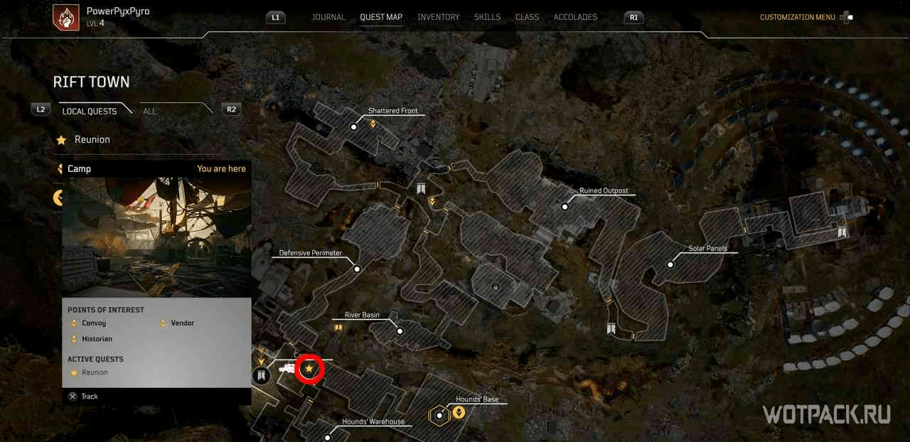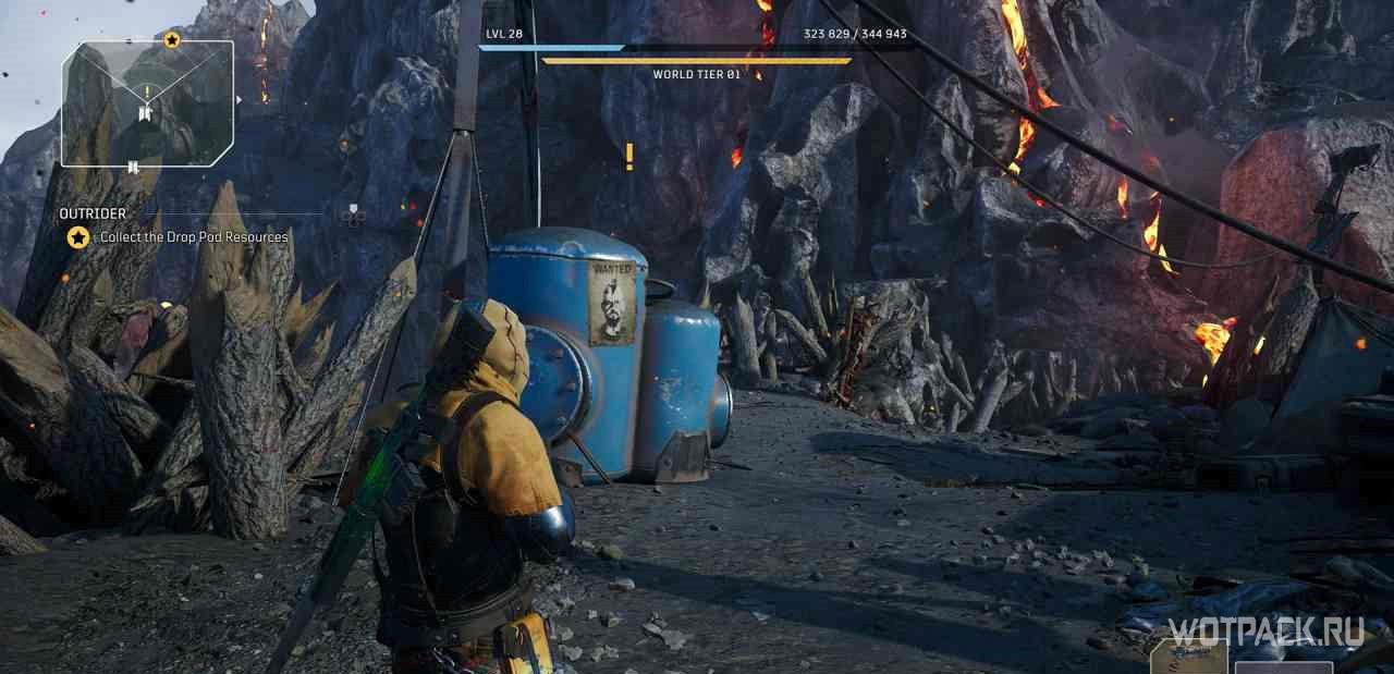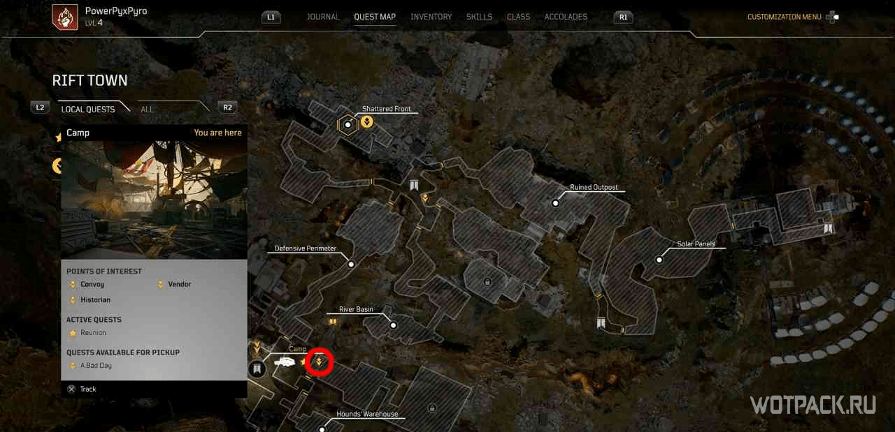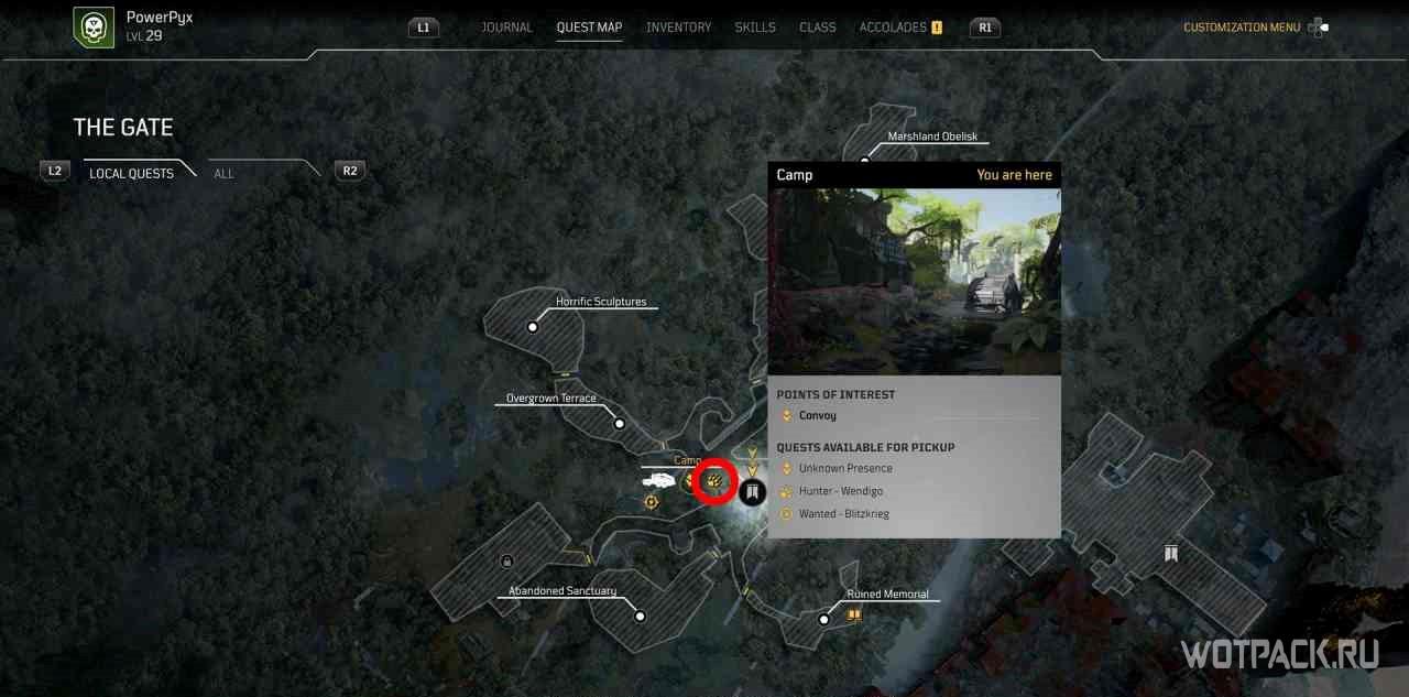 Когда игрок попадет в лагерь этой местности, на миникарте появится желтый восклицательный знак. Следуя по нему, надо изучить кости на границах привала.