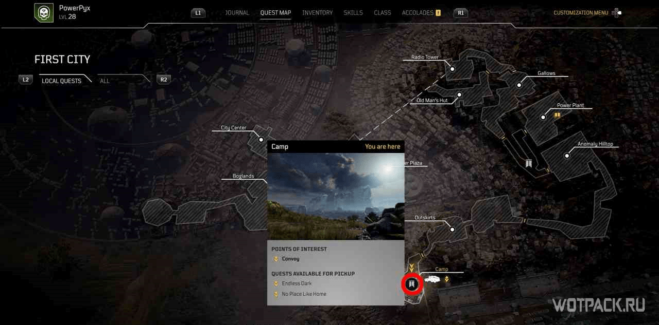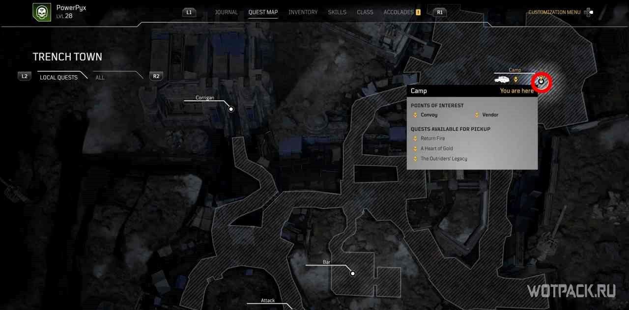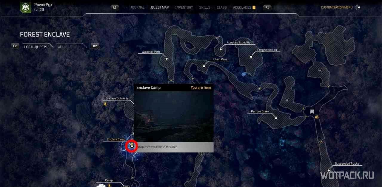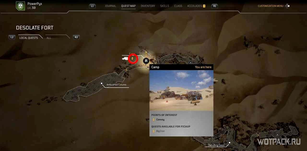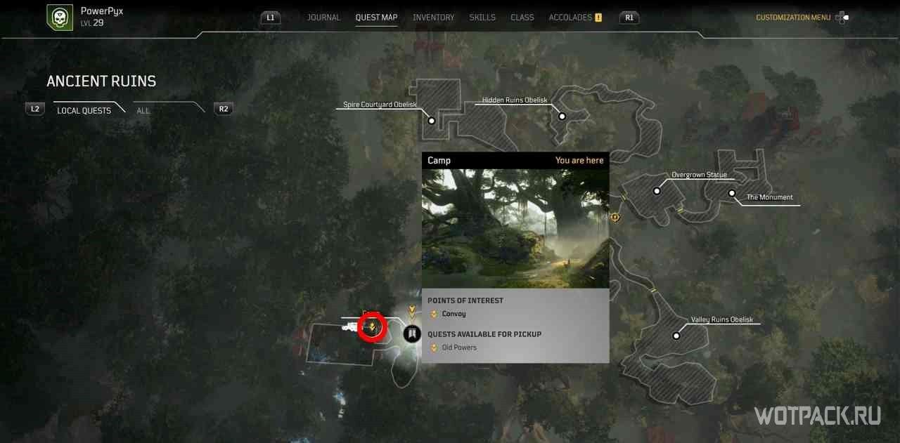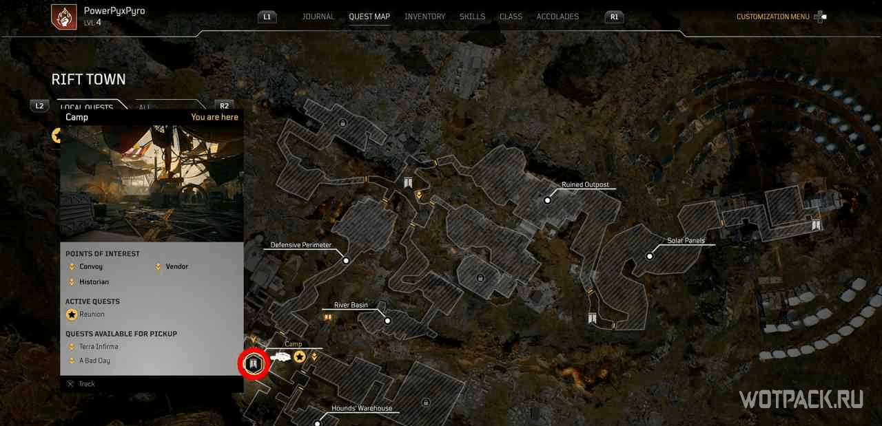 Когда игрок попадет в лагерь этой местности, на миникарте появится желтый восклицательный знак. Следуя по нему, надо изучить кости на границах привала.