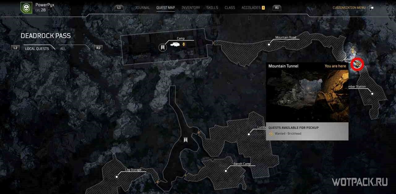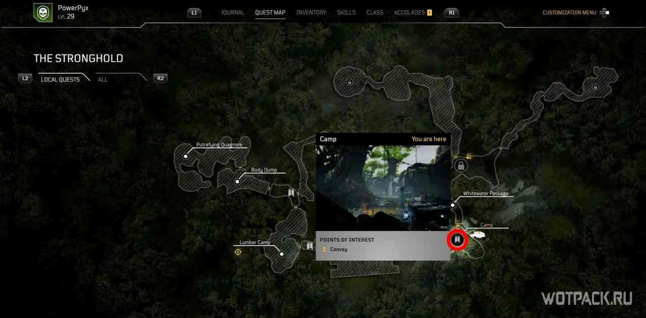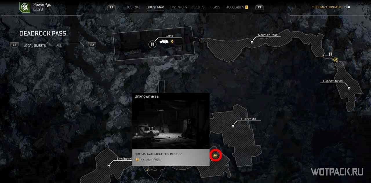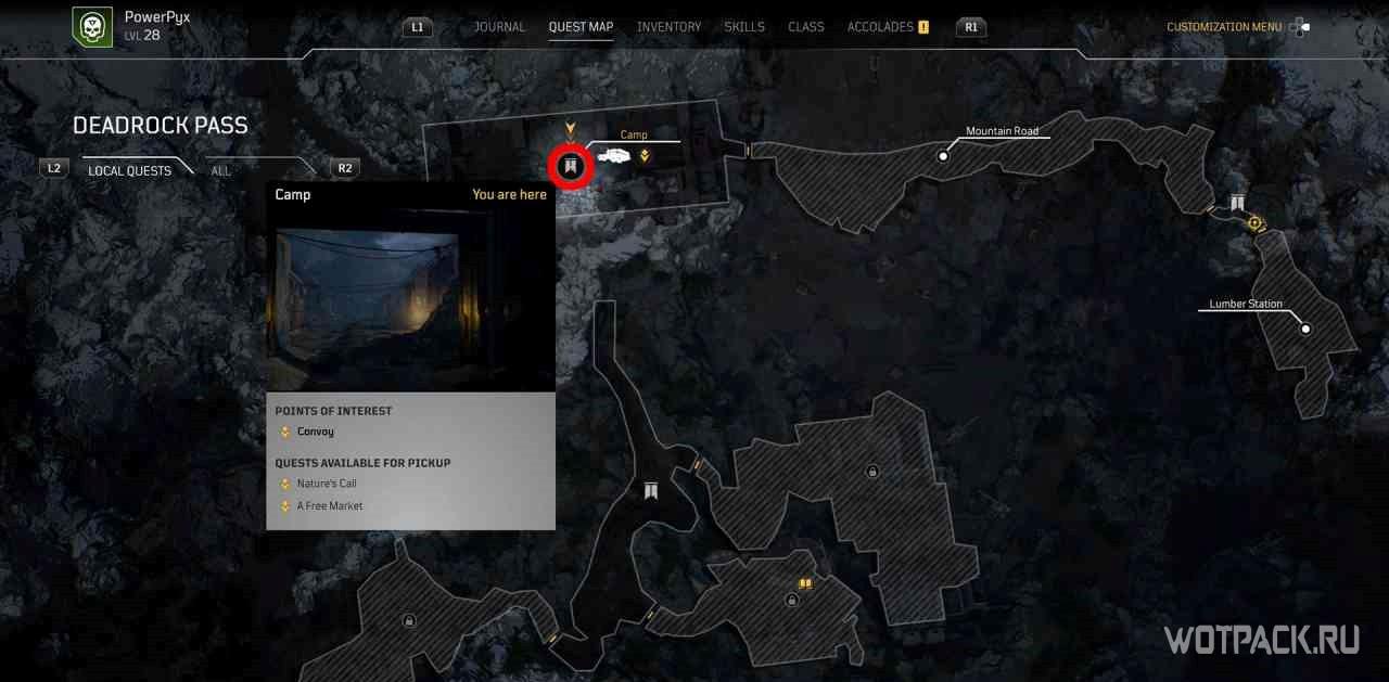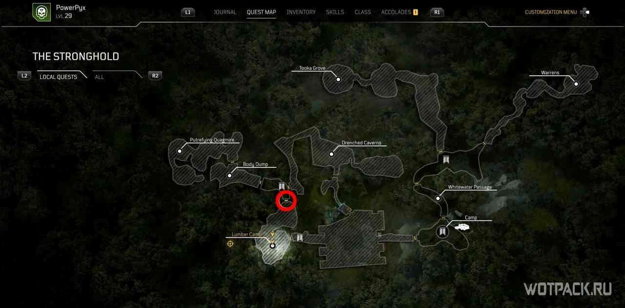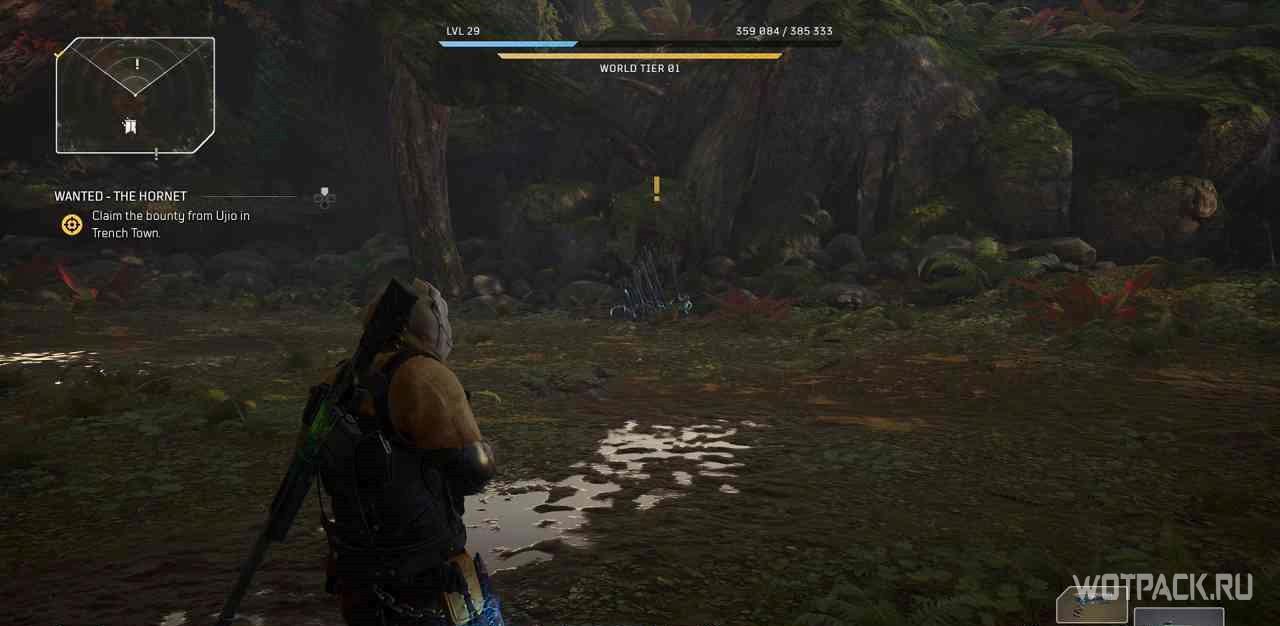 Пройдя слева от лагеря, можно найти поваленное дерево с желтым восклицательным знаком над ним. При взаимодействии с ним откроется небольшая квестовая локация и миссия активируется.