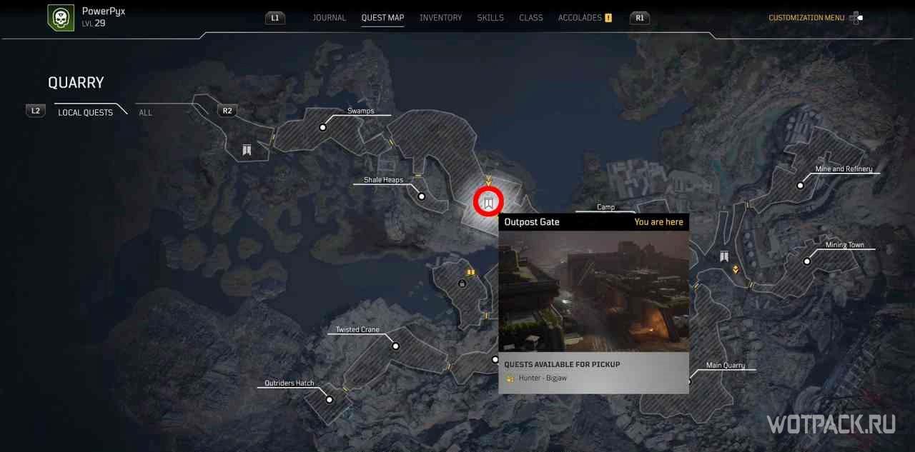 Помимо этого, можно открыть карту мира и приблизить определенные зоны. На ней желтым цветом отмечены доступные миссии, а серым уже выполненные. Благодаря этому отслеживать задания в Outriders очень просто. Также на открытой карте в левом нижнем углу показано сколько квестов каждого типа уже завершены.