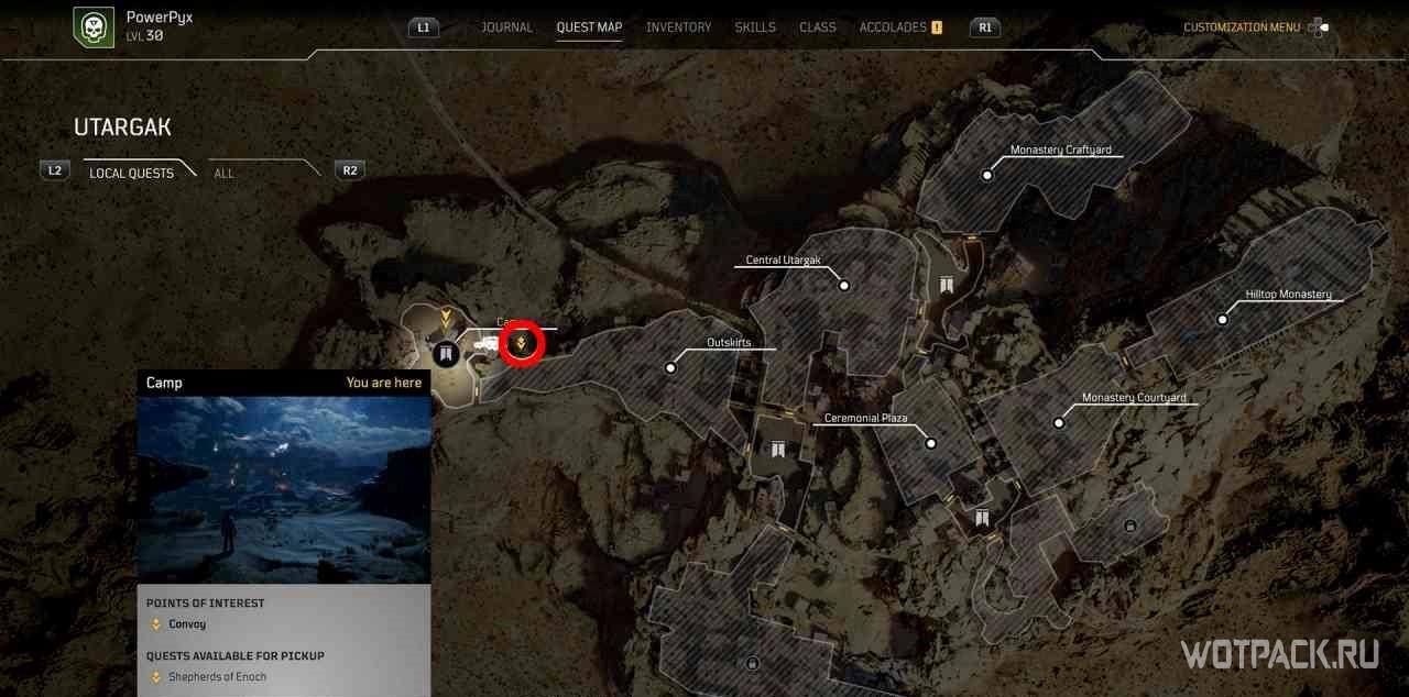 Когда игрок попадет в лагерь данной местности, на миникарте появится желтый восклицательный знак. Следуя по нему, надо выйти за пределы привала и поговорить со странником, стоящим под высоким акведуком.
