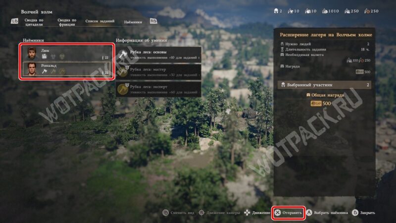 Все эти ресурсы уже есть, поэтому выберите эту миссию и окажетесь в меню назначения наёмников. Выделите Люка и Рональда, чтобы они выделились светло-серым, а затем нажмите «Отправить» («F» на клавиатуре или «X» на геймпаде).