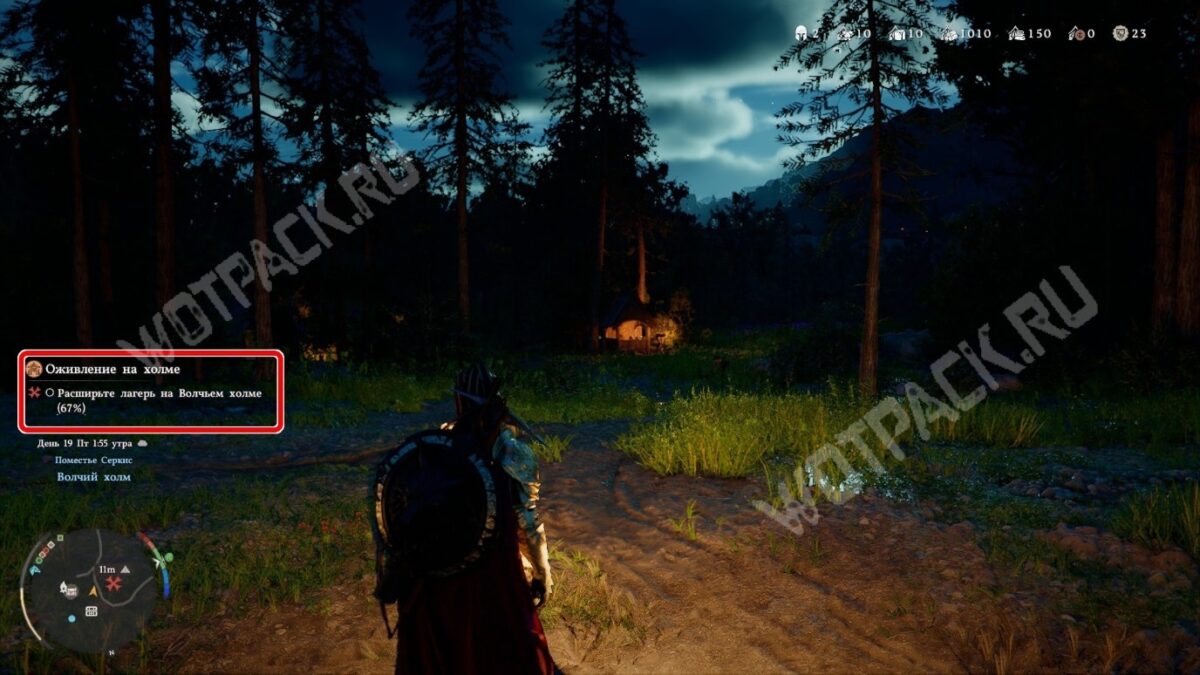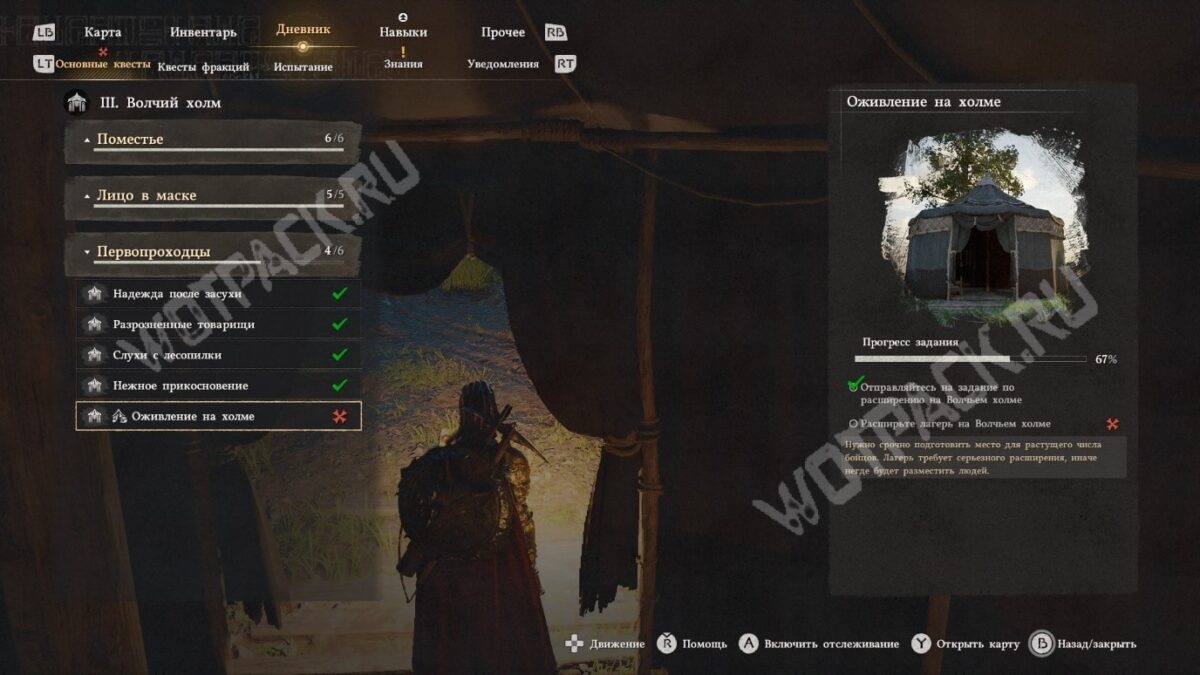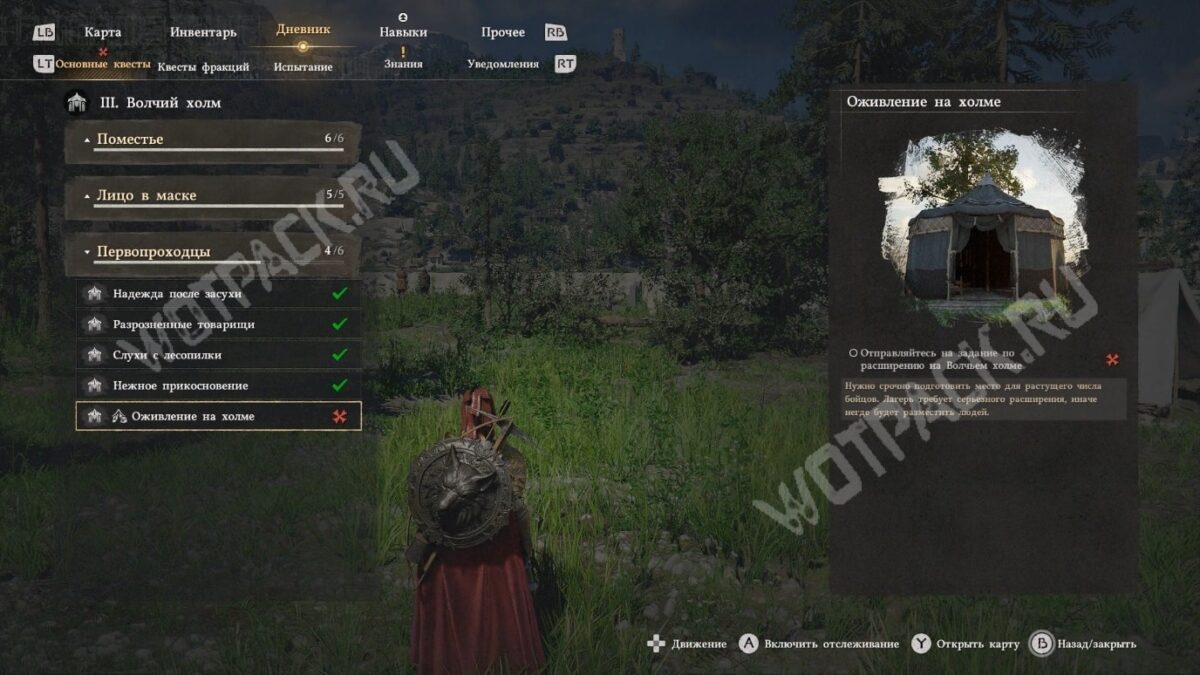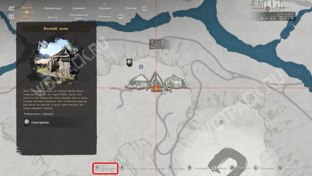 Цель звучит так, как будто куда-то нужно идти, и маркер задания указывает на лагерь, но никуда не нужно перемещаться. Откройте карту, найдите на ней Волчий холм и дважды кликните по нему «ЛКМ», если играете на клавиатуре. На геймпаде нужно сначала навести курсором, а затем нажать «Y» и активировать действие «Осмотреть».