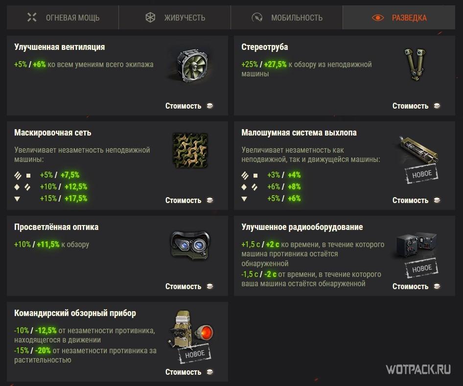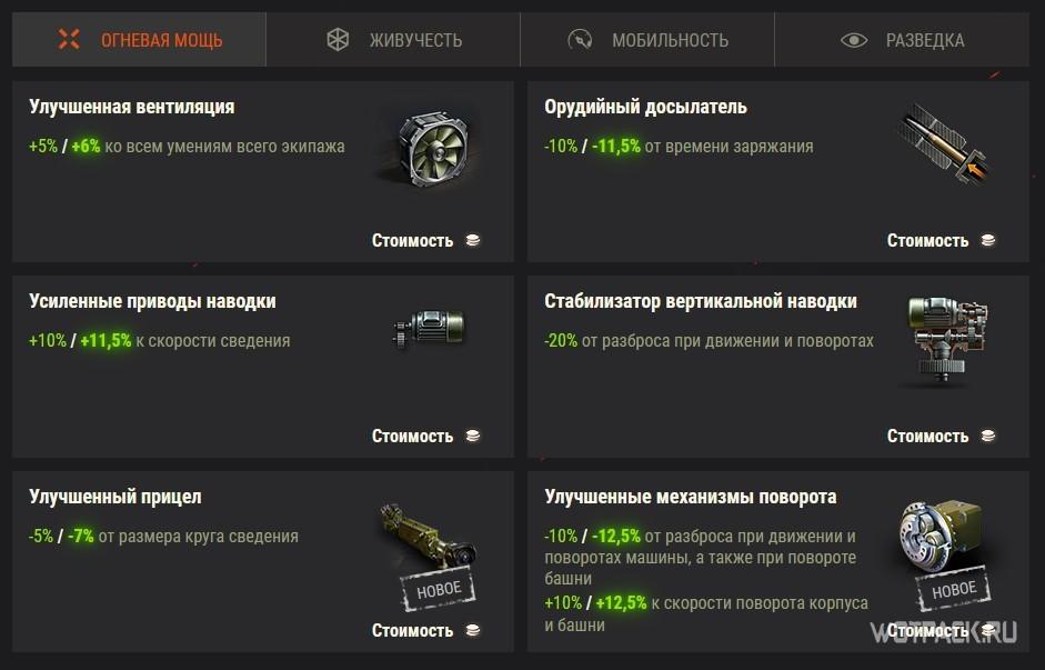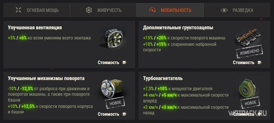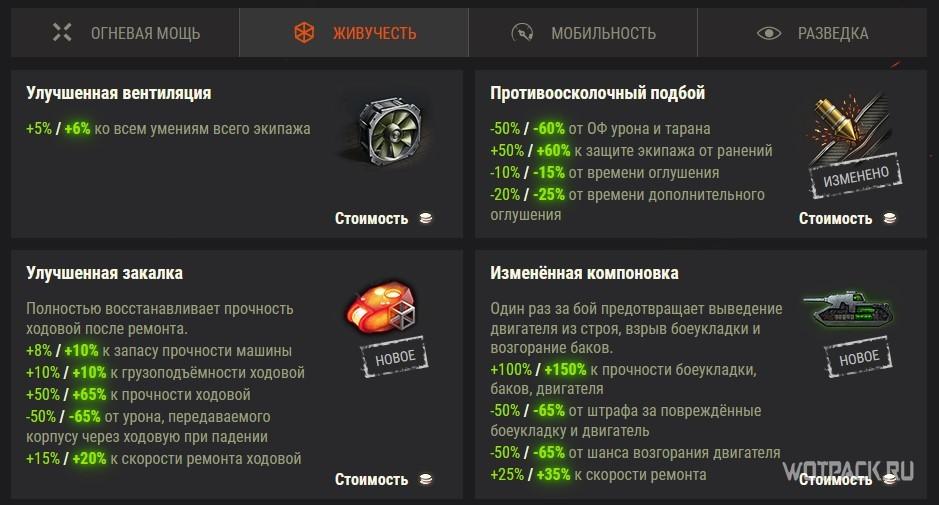 В обновлении разработчики решили эти проблемы. Теперь в игре появятся новые типы оборудования. Слоты получат обновленные категории, а также будет изменено их количество. За счет объединения уже введенного в игру оборудования настройка танка станет более вариативной.