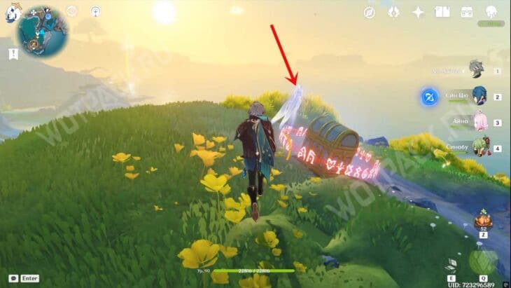 Завершите боевое испытание, после которого на вершине малой скалы от Озера Голубого Янтаря появится объект, с некоторой вероятностью содержащий монету. Всего будет два противника — один с Электро, второй с Анемо резистами.