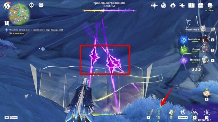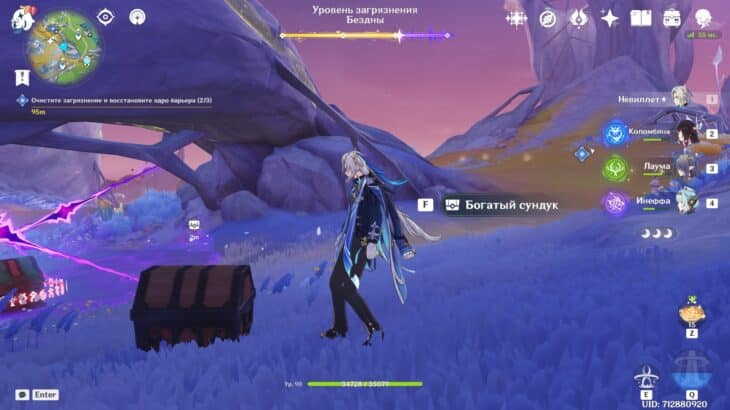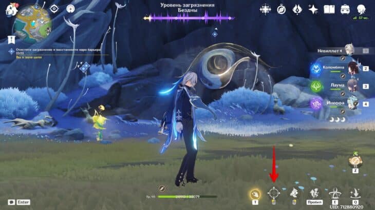 Разобравшись с врагами, зайдите в фиолетовую скверну и используйте опцию «Очистить». Здесь рекомендуем переключиться на персонажа с самым большим количеством HP.