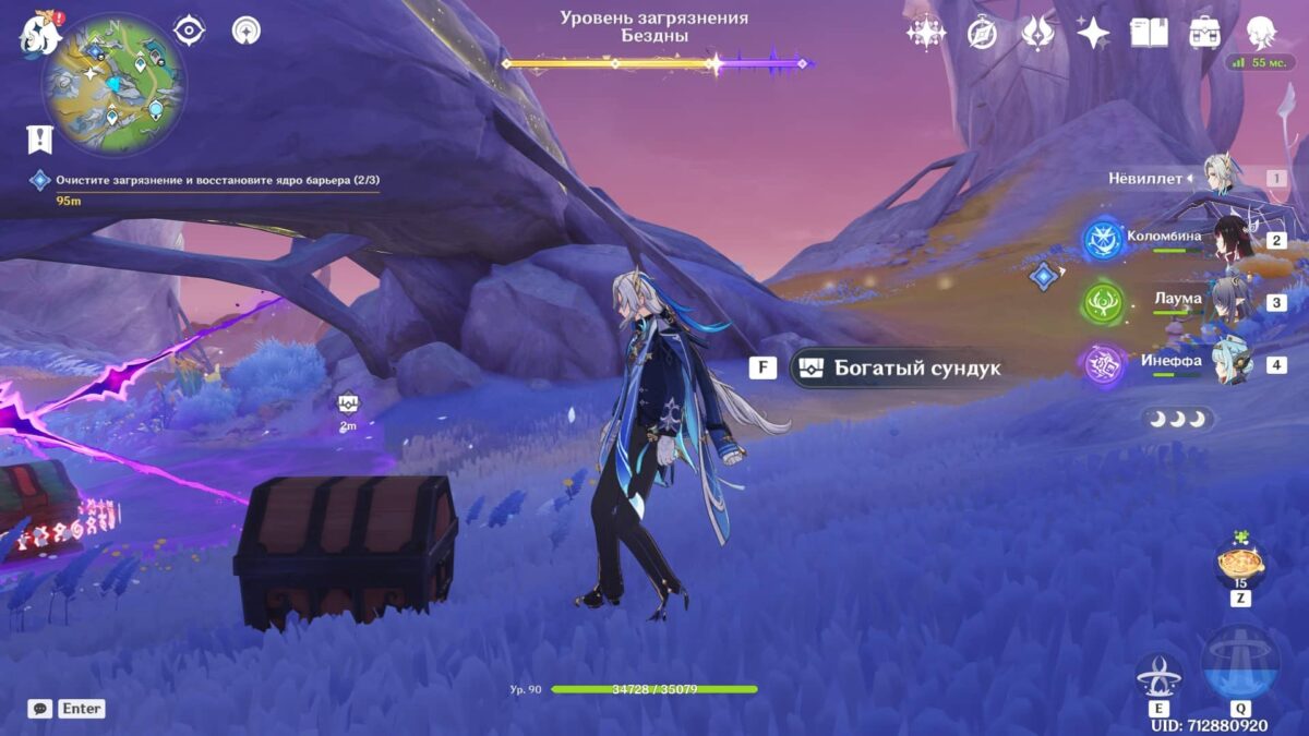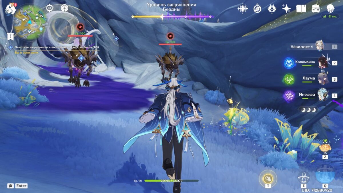 Сразившись с толпой монстров, снизите уровень загрязнения. Среди чудовищ встретятся хиличурлы разных видов и Рыболовы скрытых глубин. Последние слабы перед Лунными реакциями и элементальными атаками.