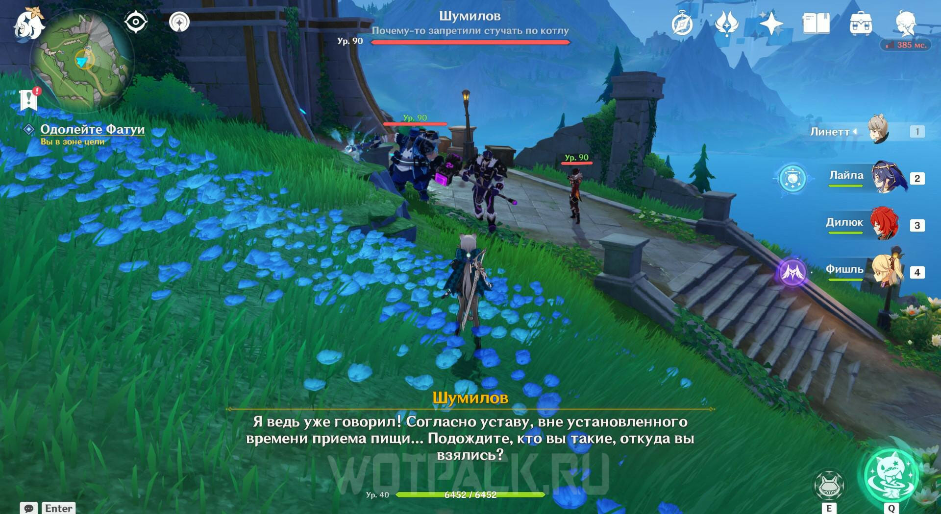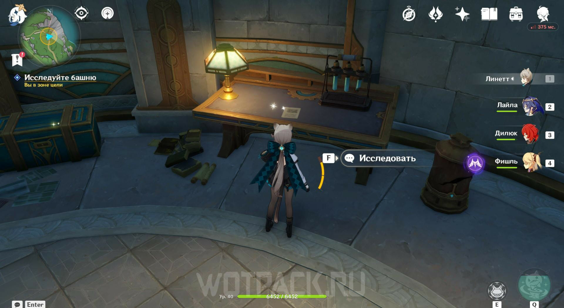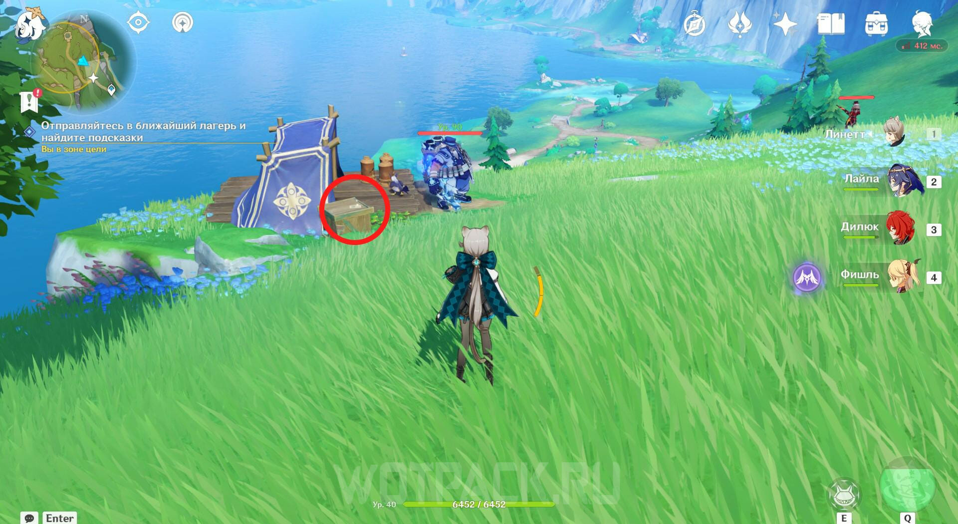 Вернитесь на один этаж ниже и прочитайте записку на столе. Покиньте башню и найдите лагерь поблизости, чтобы победить врагов в нем и посмотреть послание на ящике. Затем отправляйтесь на северо-запад и ударьте по котлу обычной атакой. Появятся трое Фатуи, с которыми нужно разобраться.