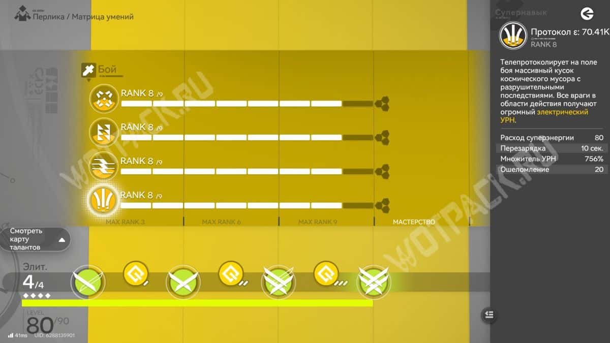 - Ульта «Протокол ε: 70.41K» — наносит огромный элементальный УРН по площади.