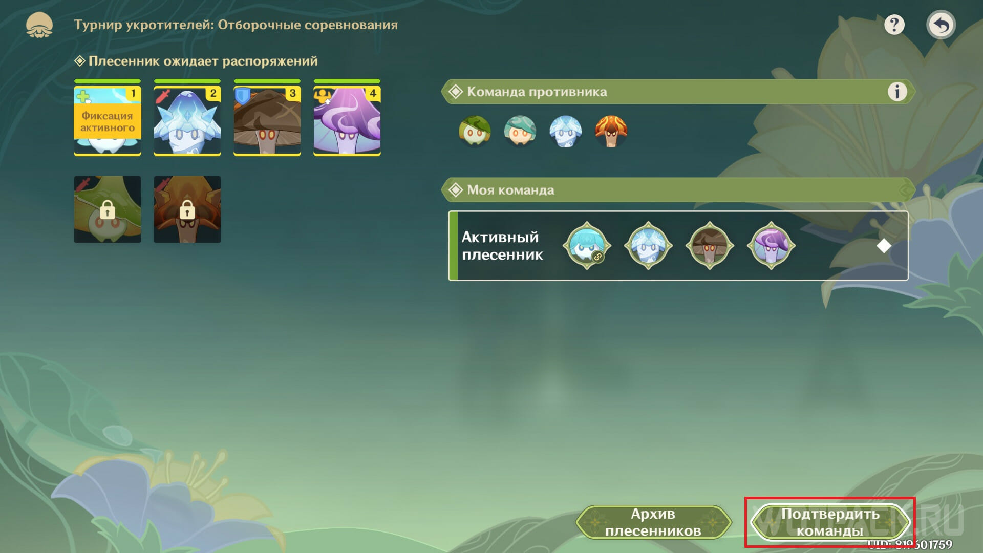 Тщательно подготовьтесь к битве и выберите самых сильных питомцев, ведь сложность этой битвы значительно выше, чем в испытаниях на атаку или оборону. В команде противника будут состоять грибы Дендро, Анемо, Пиро и Крио элементов.