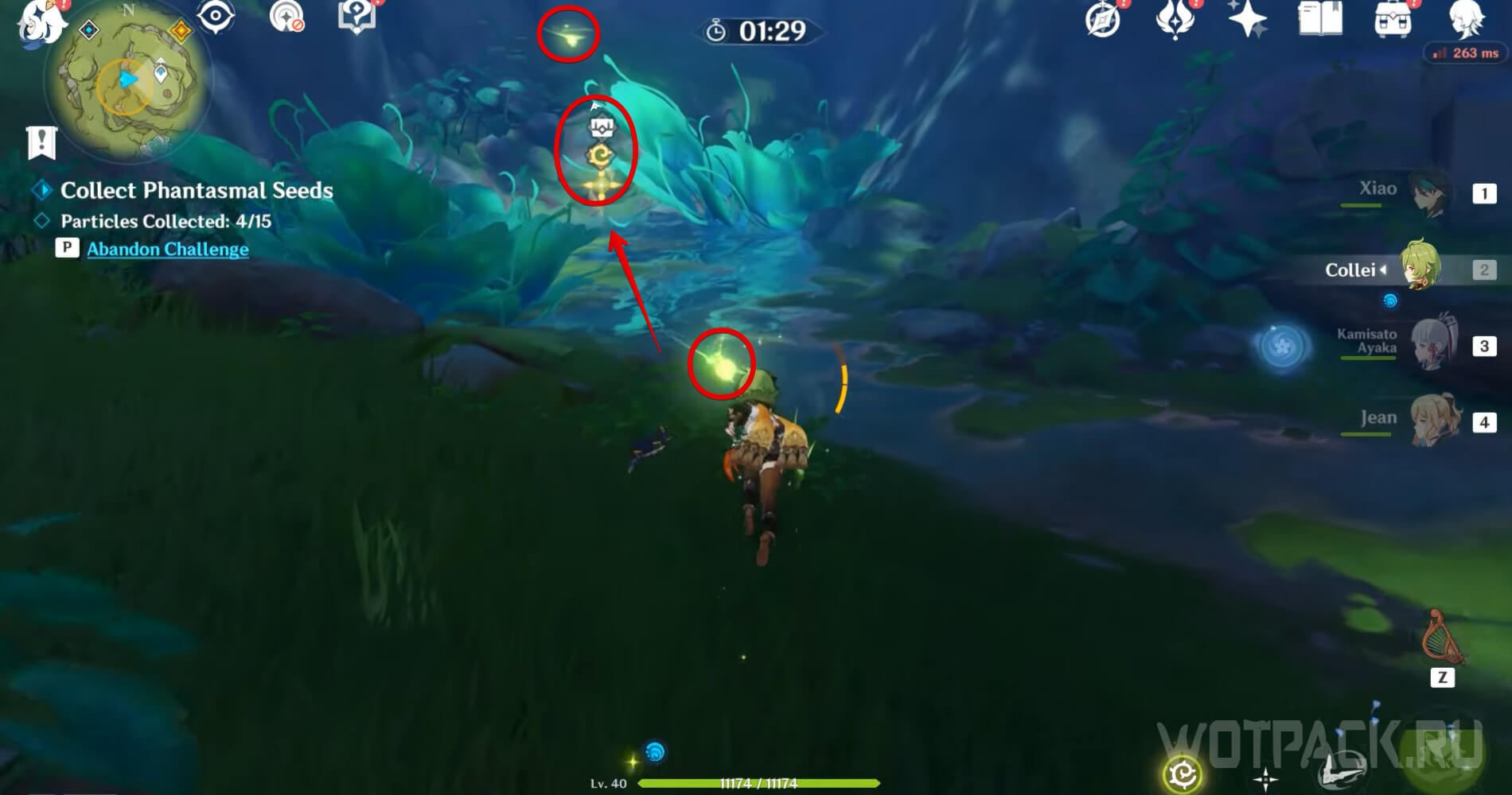 Забегите на него и двигайтесь наверх. Здесь будет большинство частиц. Чтобы срезать путь, можно воспользоваться вторым четырехлистным символом по пути. За ним находится большой плесенник и 4 частицы. Не тратьте время на сражение с ним: заберите семена и прыгайте вниз.