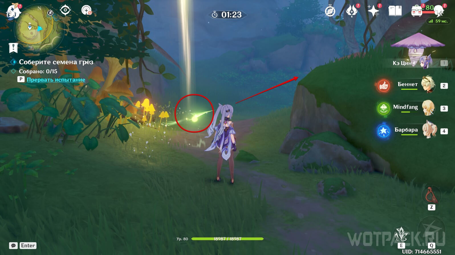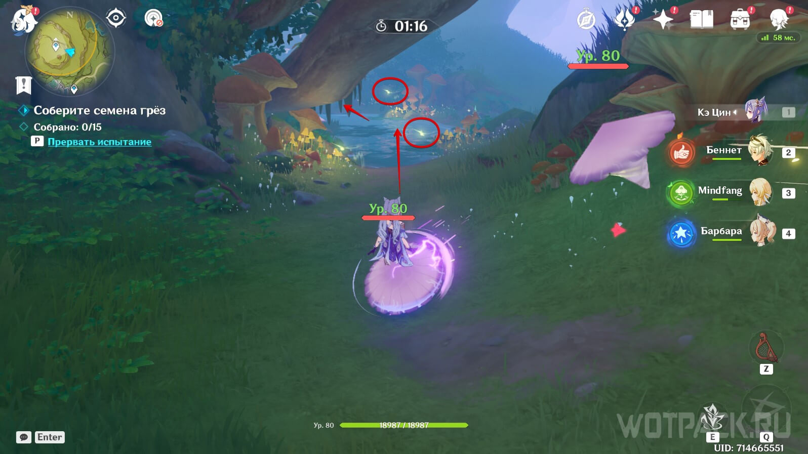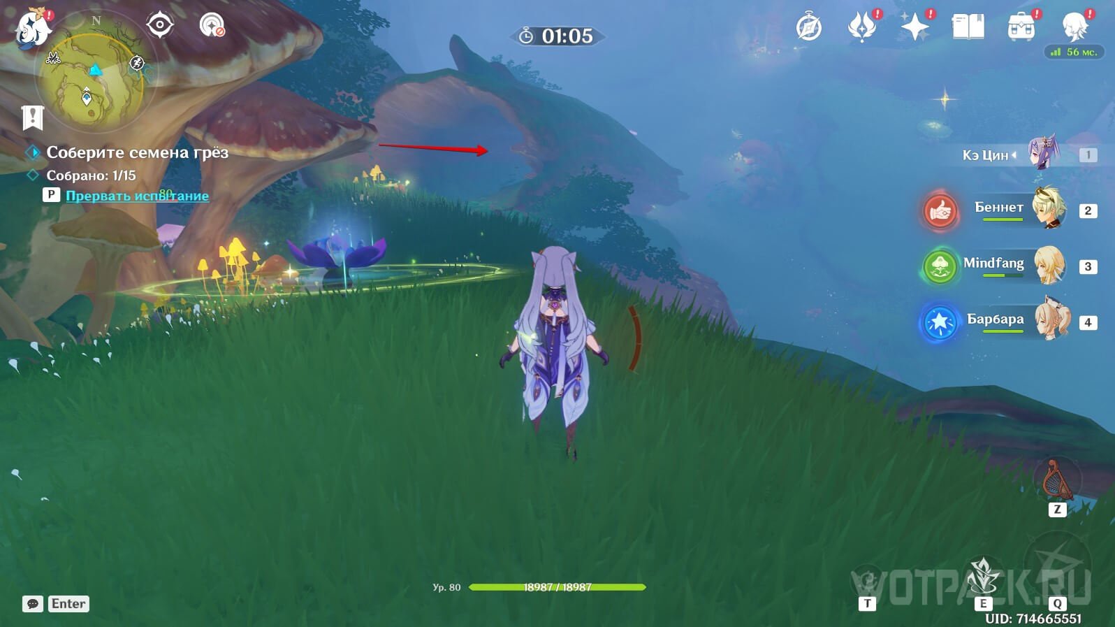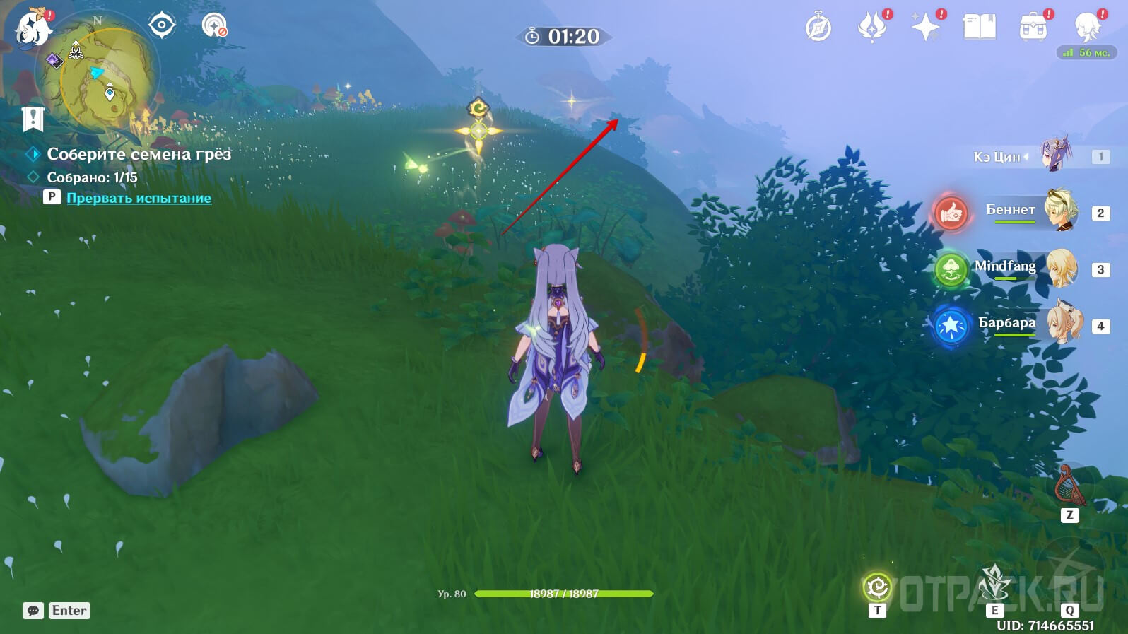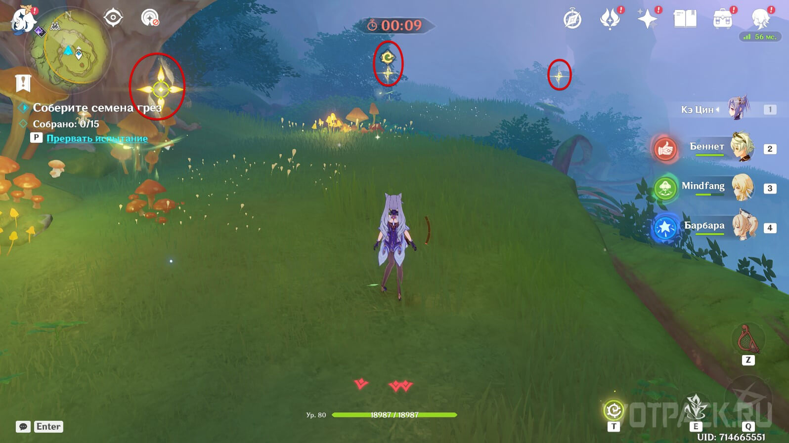 Для экономии времени рекомендуется использовать Фишль, т. к. она способна дать Электро разряд Ешкой и является лучником, т.е. может попасть в символ над сундуком и снять печать. Однако кулдаун ее стихийного навыка слишком долгий, поэтому первый гриб активируйте любым другим персонажем, который способен сделать это. Второй зарядите через Фишль, заберитесь на платформу и выстрелите в печать.