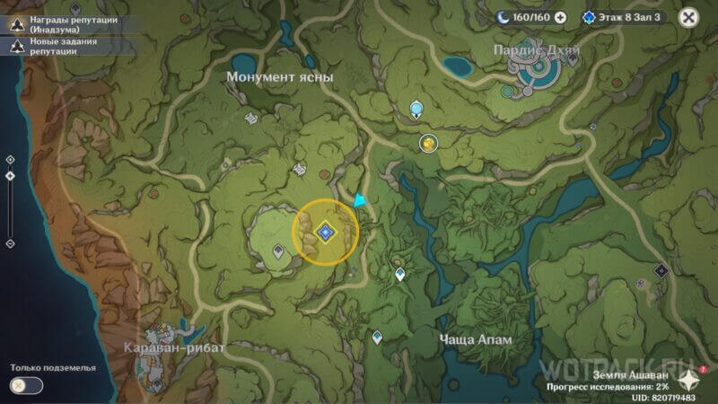 Переместитесь к Cтатуе Архонта Земель Ашаван и идите по дороге в сторону Каравана-рибат. На середине пути, у развилки, сместите фокус внимания на горную «стену», – взберитесь по ней до равнины – таким образом, сэкономите время.