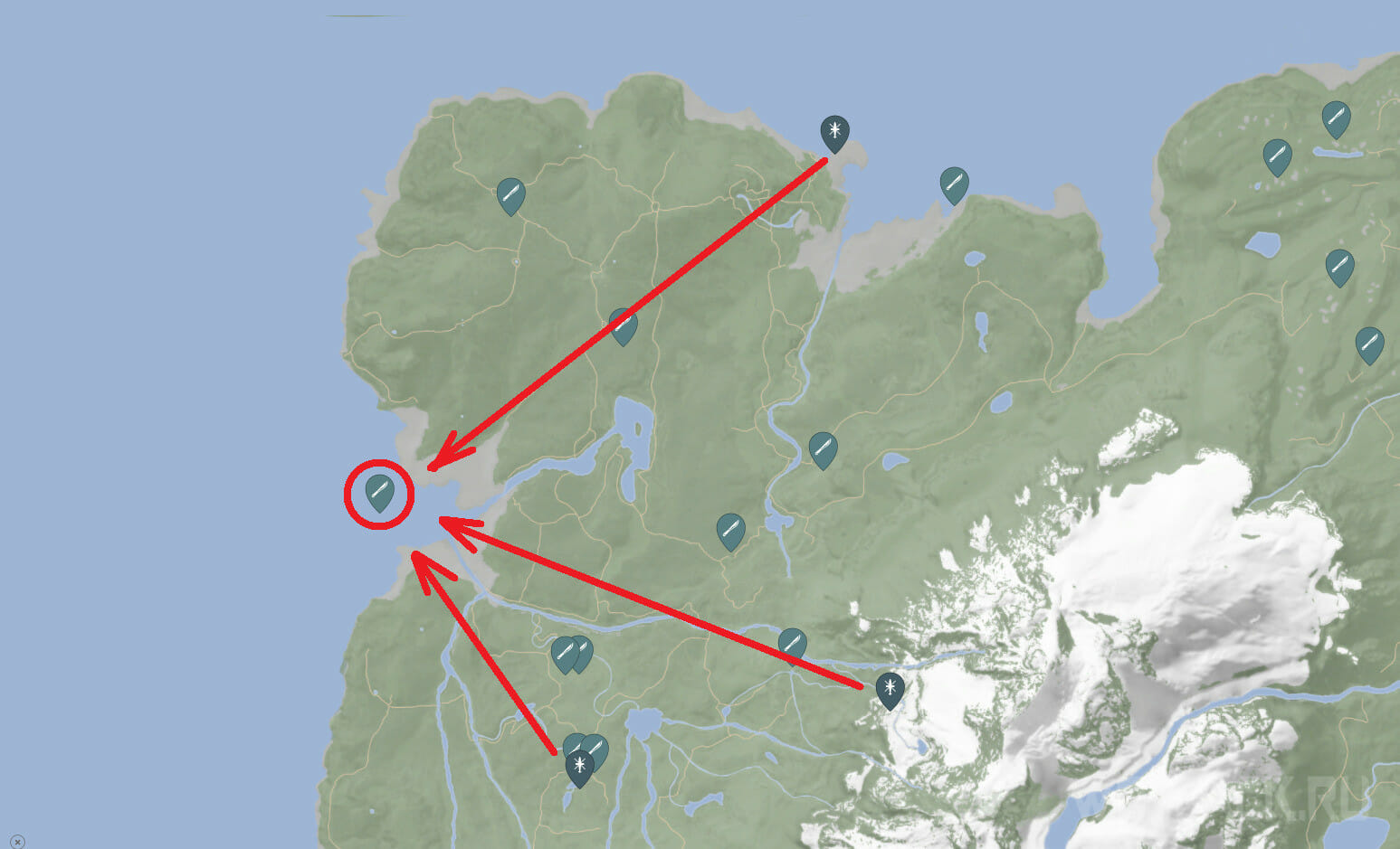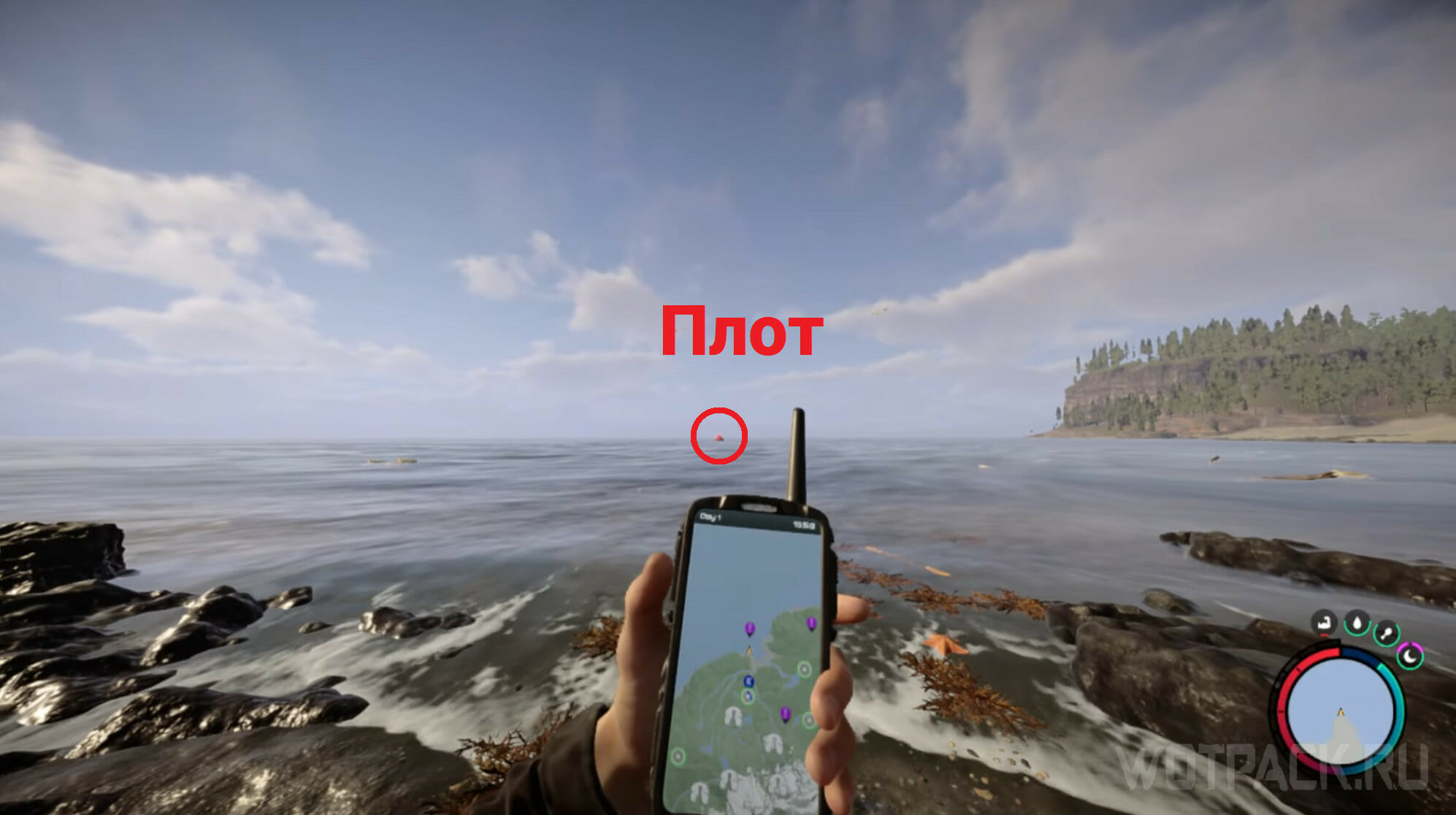 Первый пистолет можно найти в бухте, расположенной на западе карты, в центре побережья. Добравшись до нужного места, обнаружите вдалеке красный спасательный плот. Добраться до него можно лишь вплавь, использовать что-либо для переправы не получится.