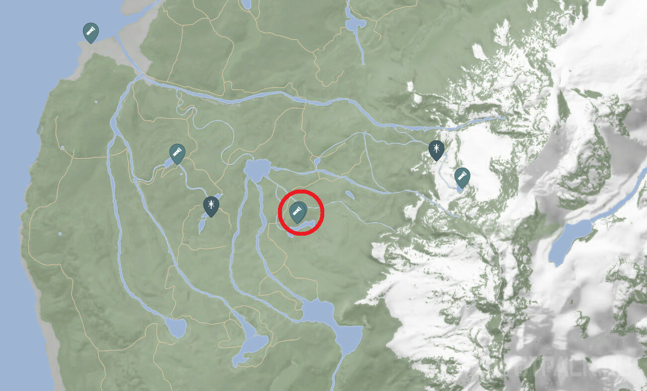Еще одно место, где можно найти пистолет, расположено на юго-востоке острова, рядом с крупным озером. Добравшись до нужных координат, осмотритесь, чтобы найти небольшую скалу. С западной ее стороны есть щель, через которую удастся пробраться внутрь бункера. Предварительно потребуется добыть ключ-карту персонала, чтобы забрать второй пистолет в Sons Of The Forest.