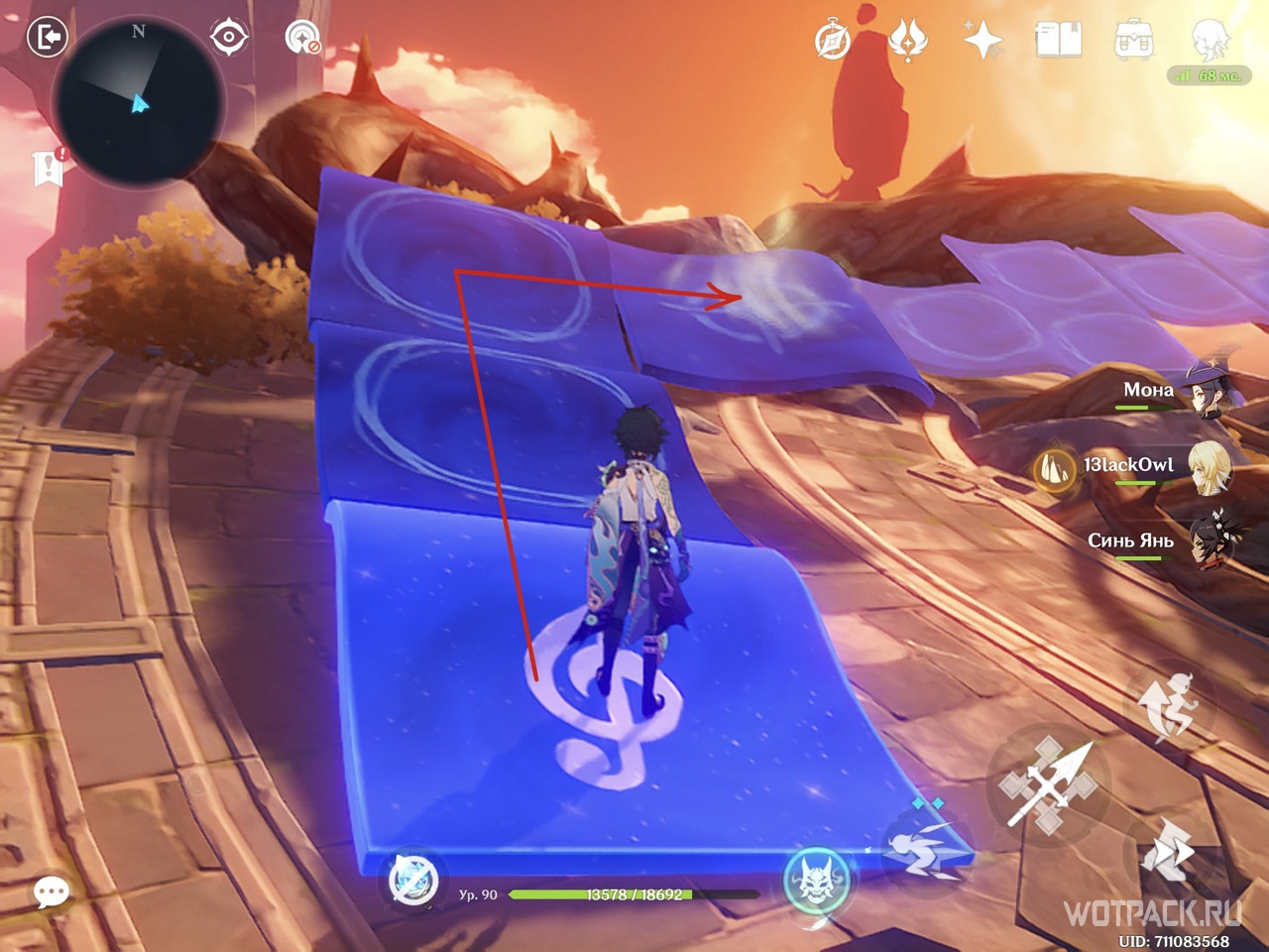 Дальше ведет только один путь: сыграйте на арфе и перелетите на соседнюю платформу. Слева подойдите к обычному сундуку(4). Его охраняют хиличурлы и Пиро маг Бездны.