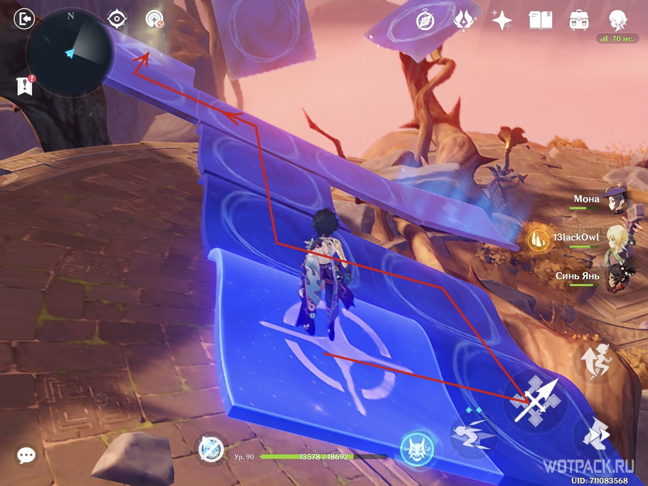 Группа перенесется в иллюзорное пространство. Оно выглядит как скопление пустынных парящих островов. Доверьтесь Паймон и отправляйтесь в ярко освещенное место.